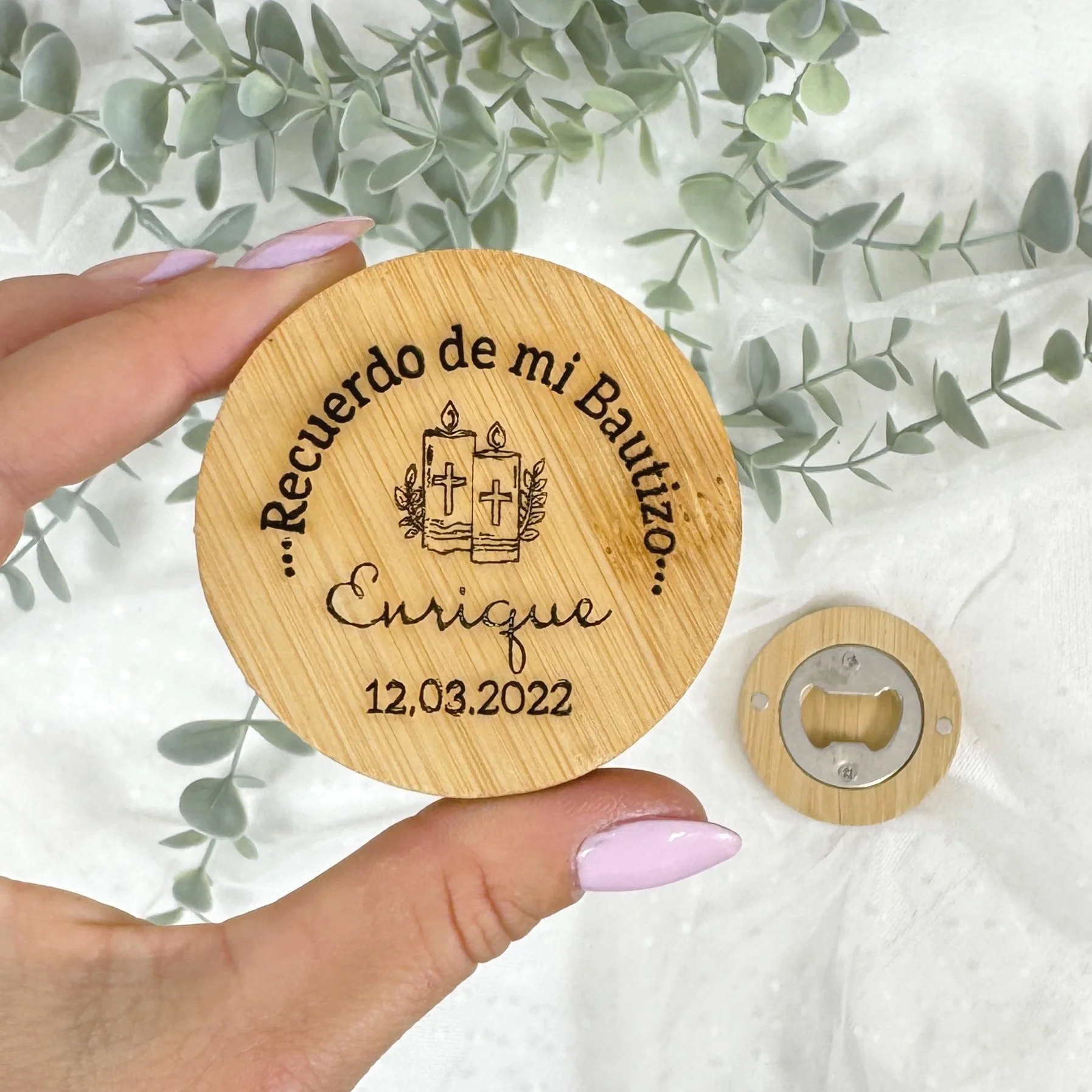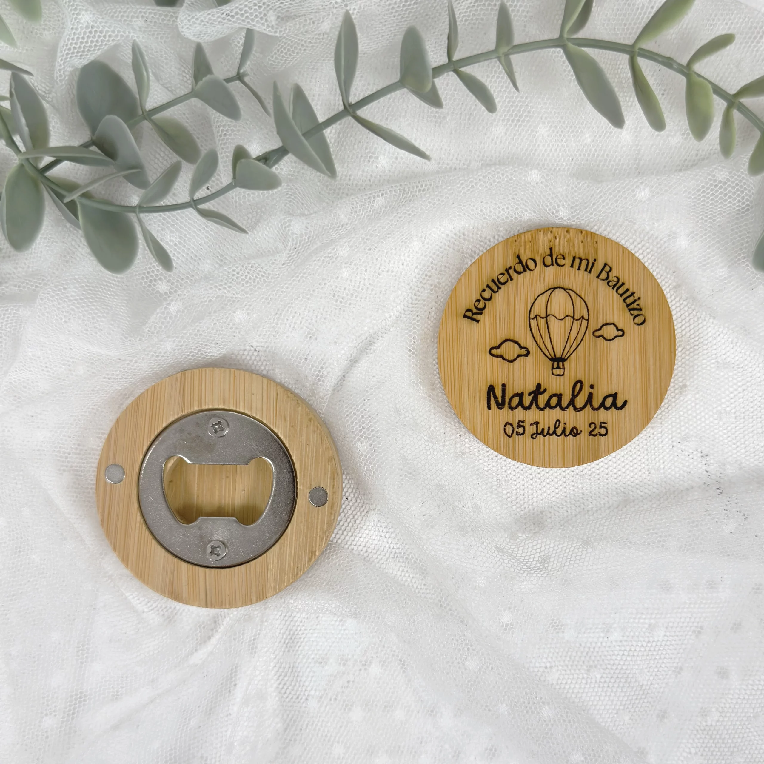 El abridor está fabricado en madera de bambú natural y cuenta con una base metálica que incorpora dos imanes en la parte trasera, para que pueda colocarse fácilmente en la nevera. ¡Así cada vez que lo usen para abrir una botella, recordarán con cariño el bautizo de tu peque!