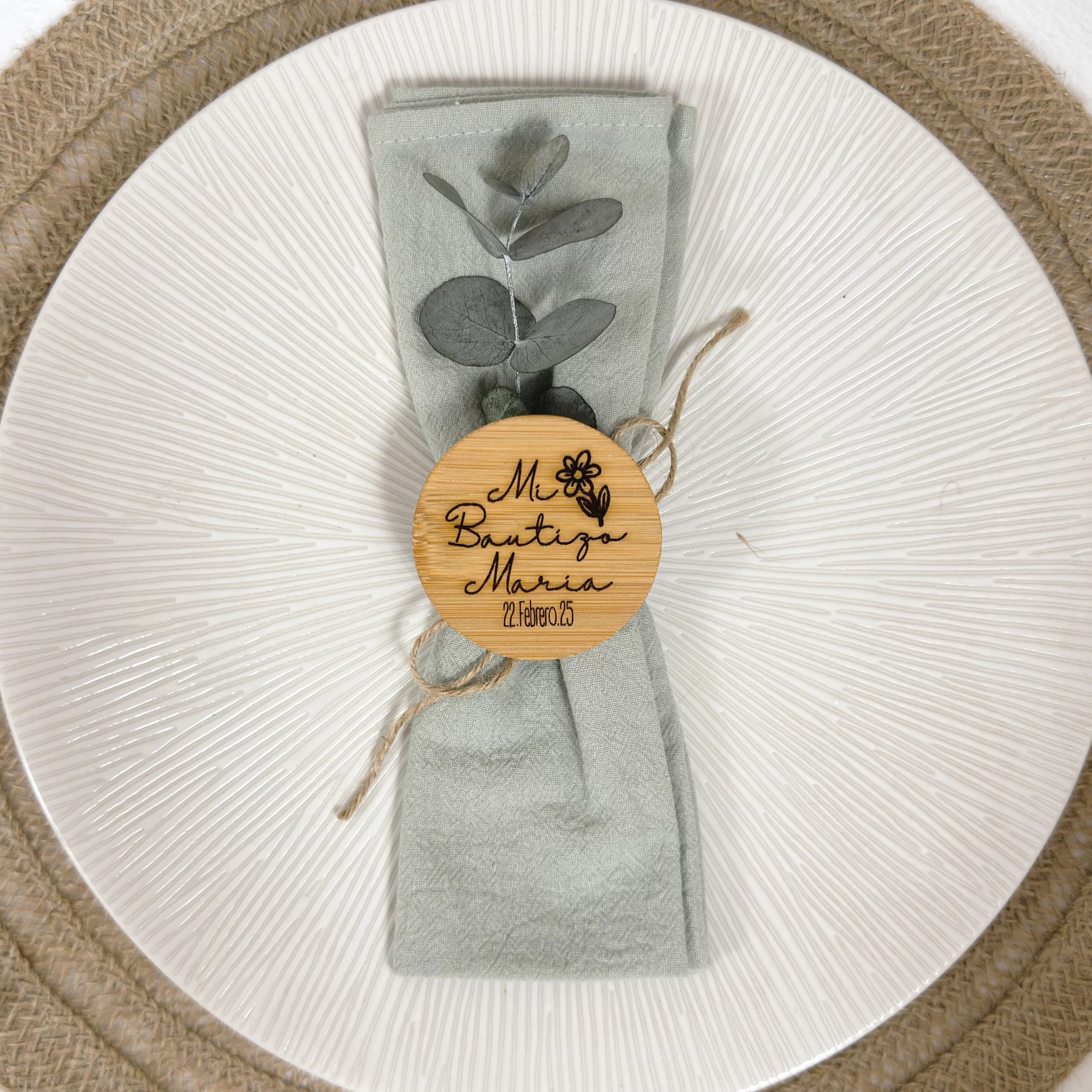 El abridor se graba con láser en la parte frontal, con el nombre del bebé, la fecha del bautizo y el diseño que tú elijas. Y si seleccionas la opción «listo para regalar», la etiqueta añadida llevará el mismo diseño, pero impresa a color.