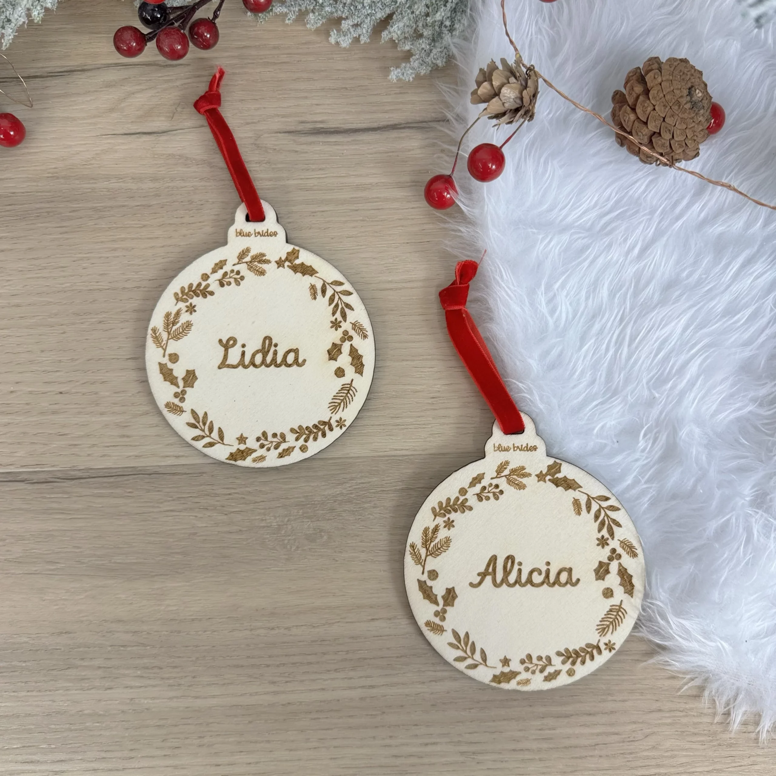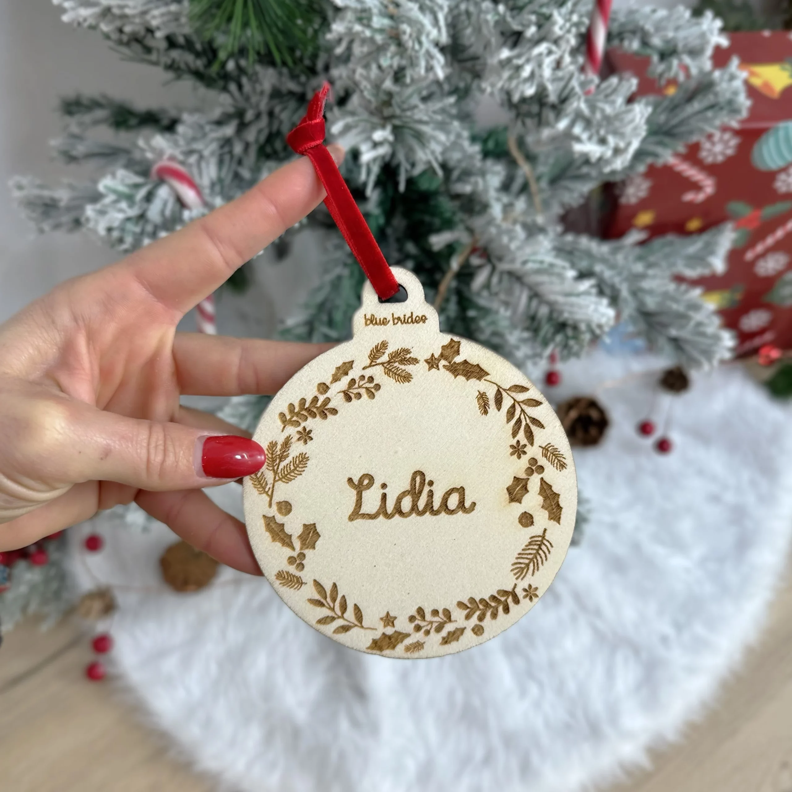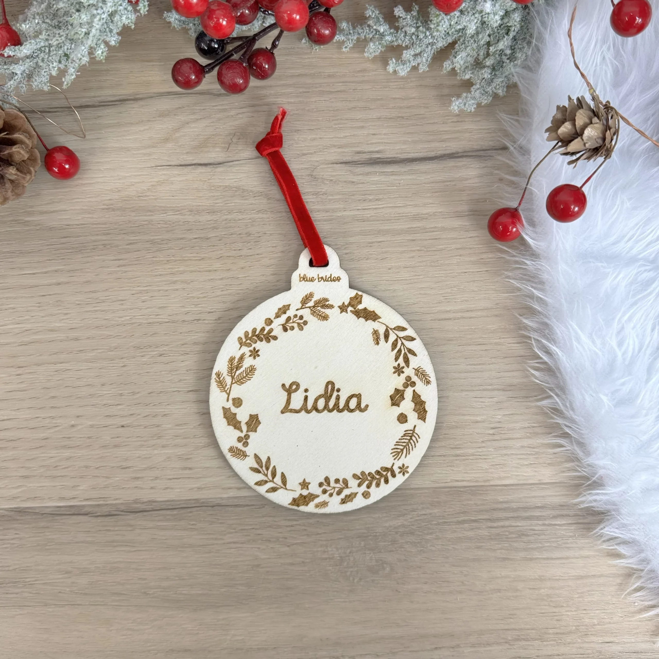 Fabricado en madera natural, este adorno aporta un toque precioso al árbol de Navidad con el acabado cálido de la madera. Personalízalo con el nombre que desees y conviértelo en un recuerdo que formará parte de vuestras navidades cada año.