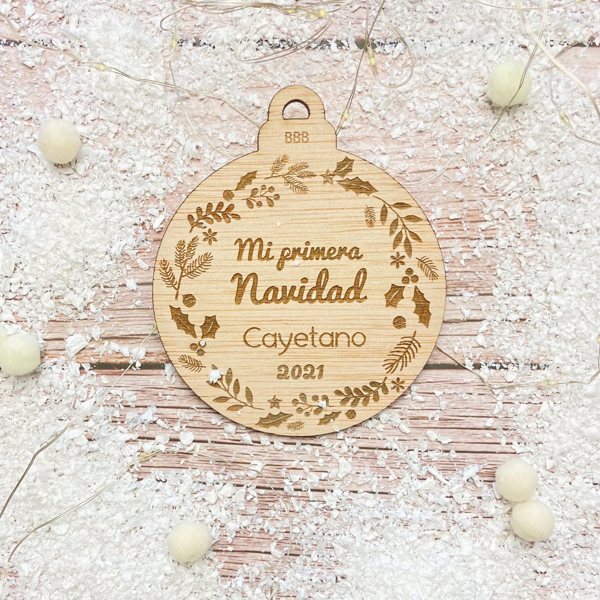 Adorno de Navidad en forma de bola de madera, personalizada con el nombre del peque o la peque que pasa su primera Navidad en casa.