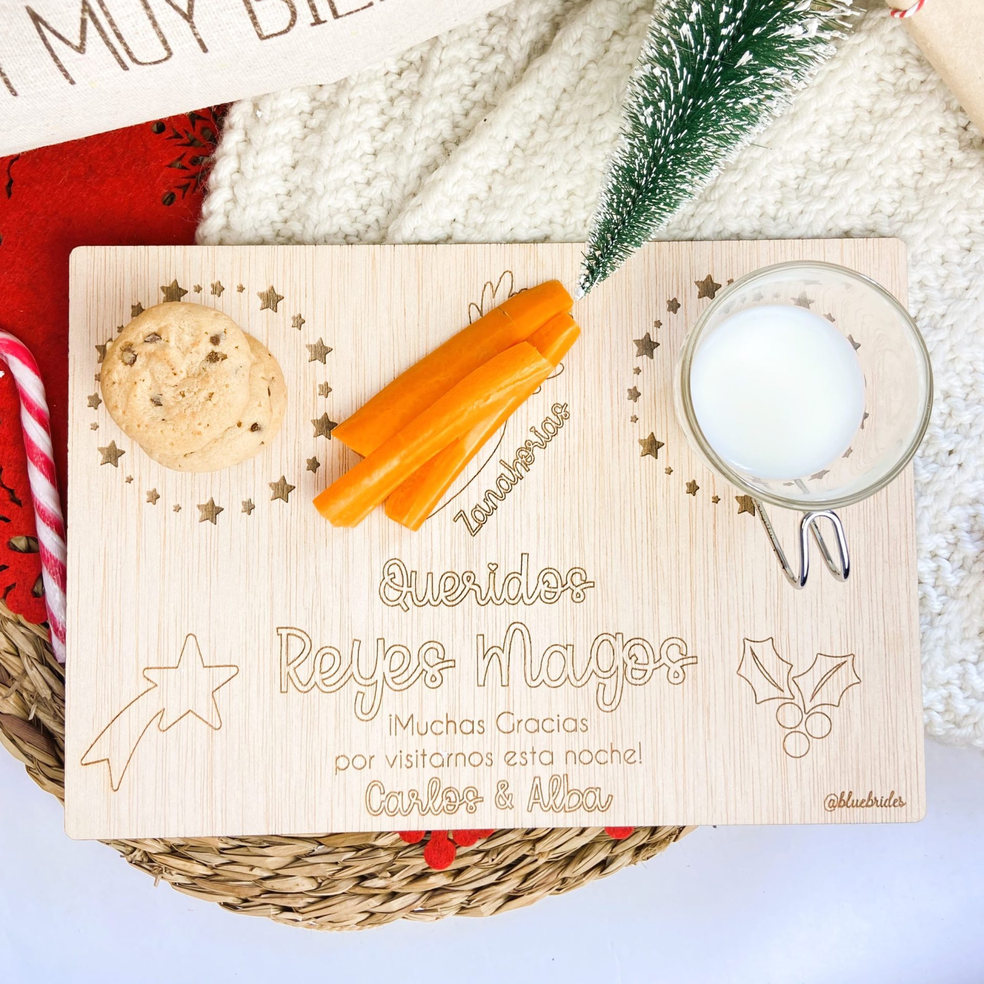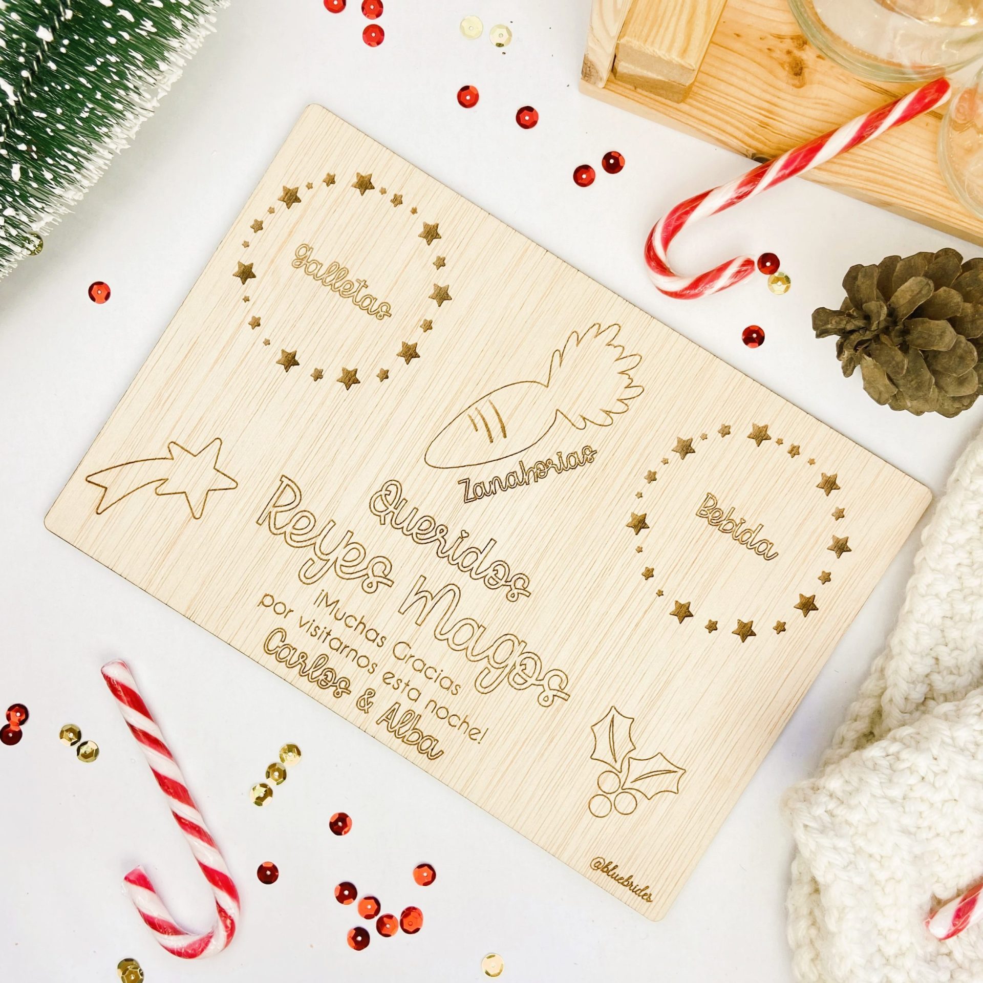 ¿Te gustaría añadir un toque mágico a la noche de Reyes o de Navidad? Nuestra bandeja Reyes Magos y Papá Noel es perfecta para que los más pequeños dejen sus galletas, leche y zanahorias para Sus Majestades de Oriente o Santa Claus. Fabricada en madera natural de alta calidad y grabada con láser, esta bandeja combina un diseño bonito con funcionalidad. Incluye espacios marcados para colocar dulces, una bebida caliente y un pequeño regalo, así como frases que evocan la ilusión y la tradición de dejar algo para los Reyes o Papá Noel.