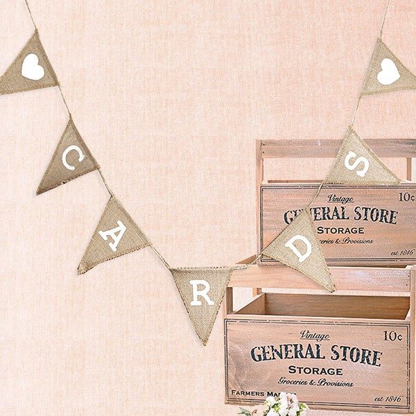 - Rincón de los deseos: Crea un rincón especial en tu boda donde los invitados puedan dejar tarjetas con sus mejores deseos. Este banderín de yute «CARDS» será el toque final perfecto para guiar a los invitados a ese espacio.