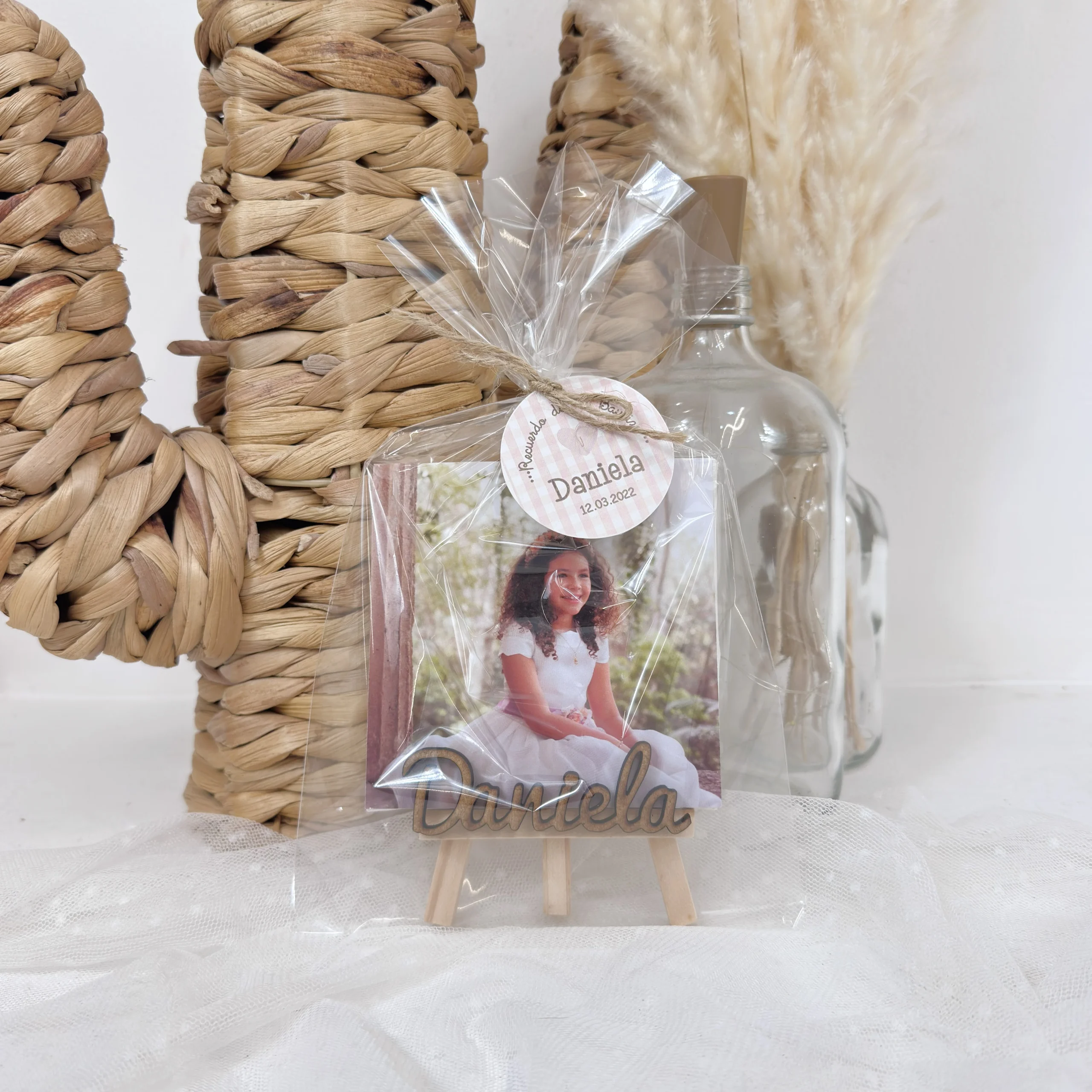 Si estás buscando un detalle para invitados de comunión personalizado que realmente emocione, este caballete con foto es una opción perfecta.