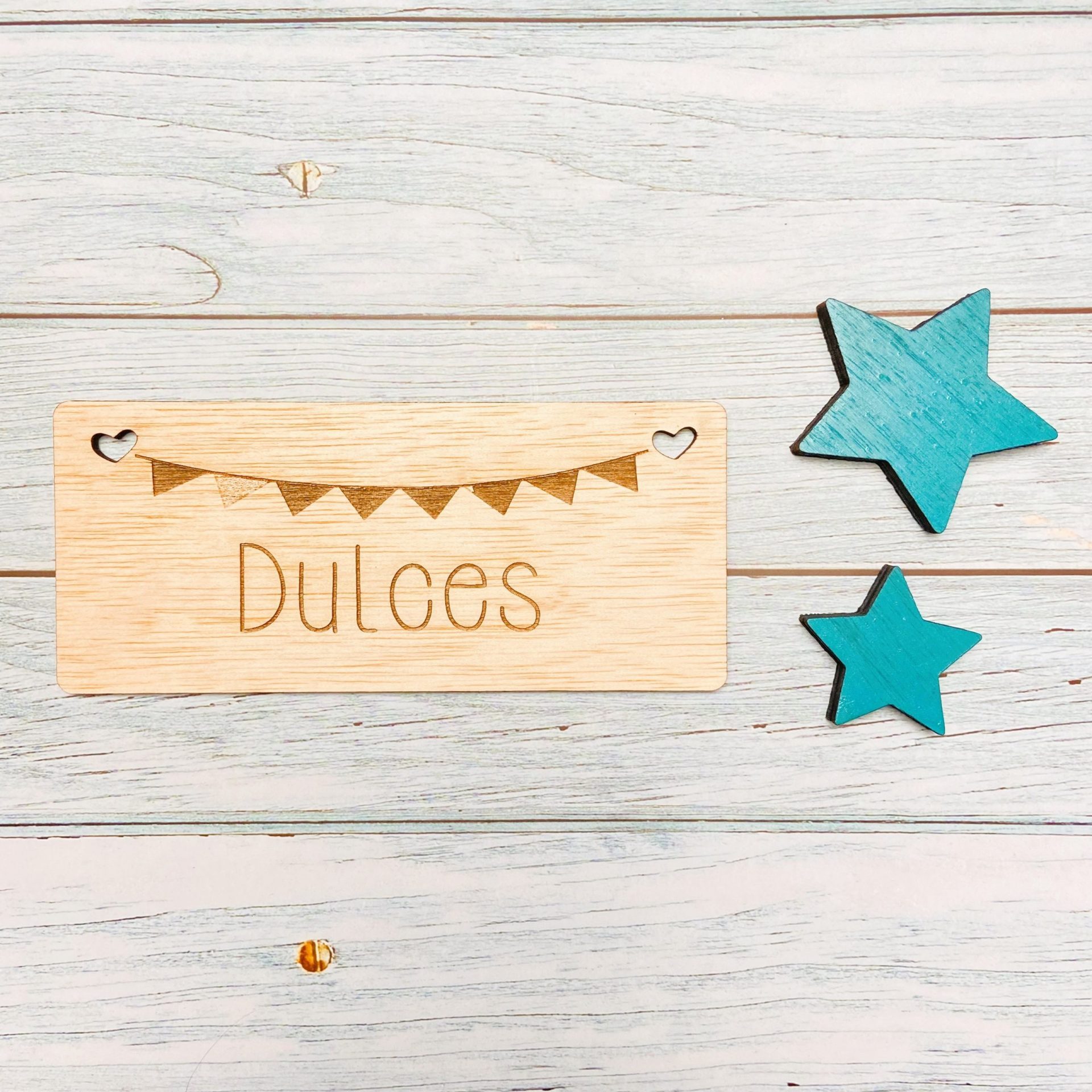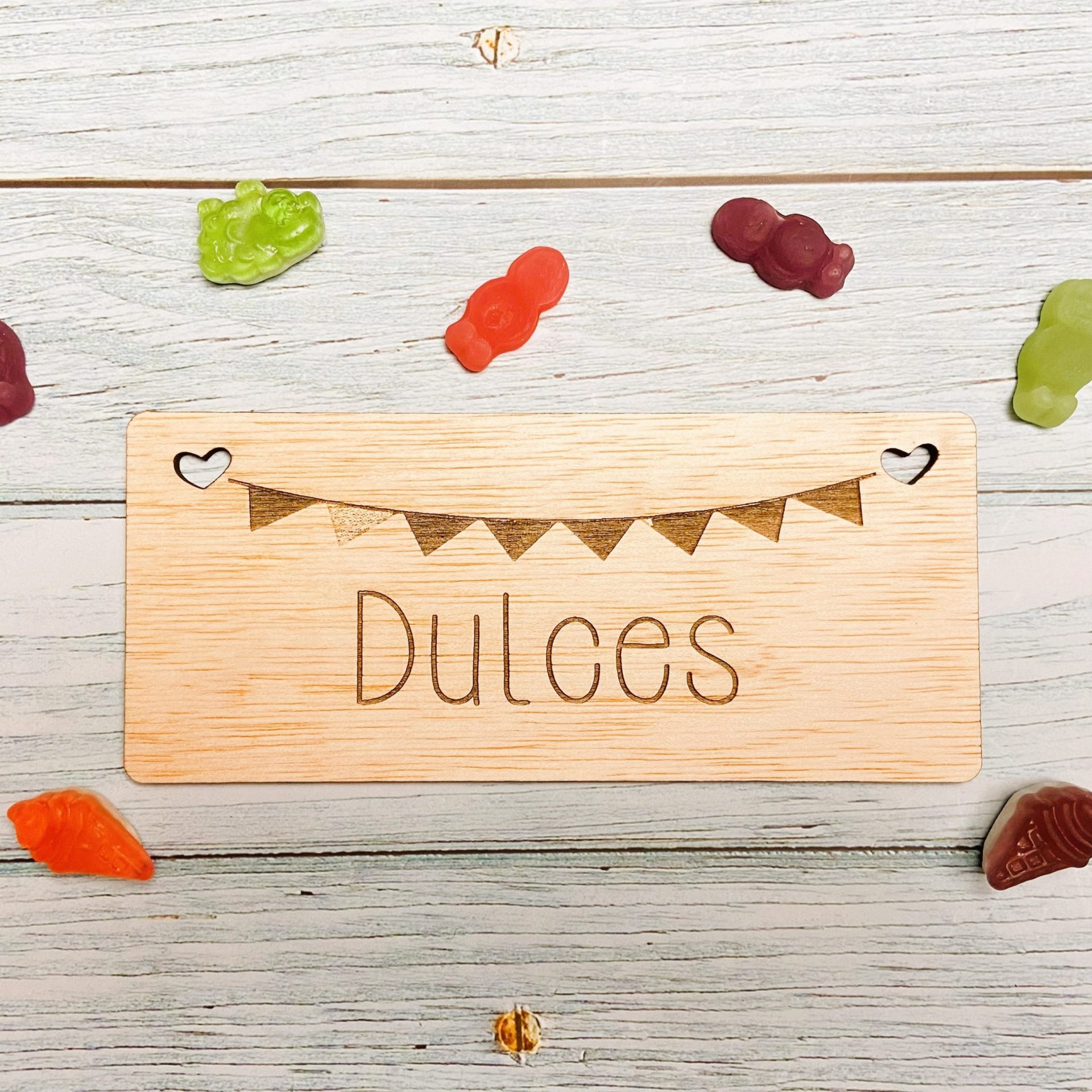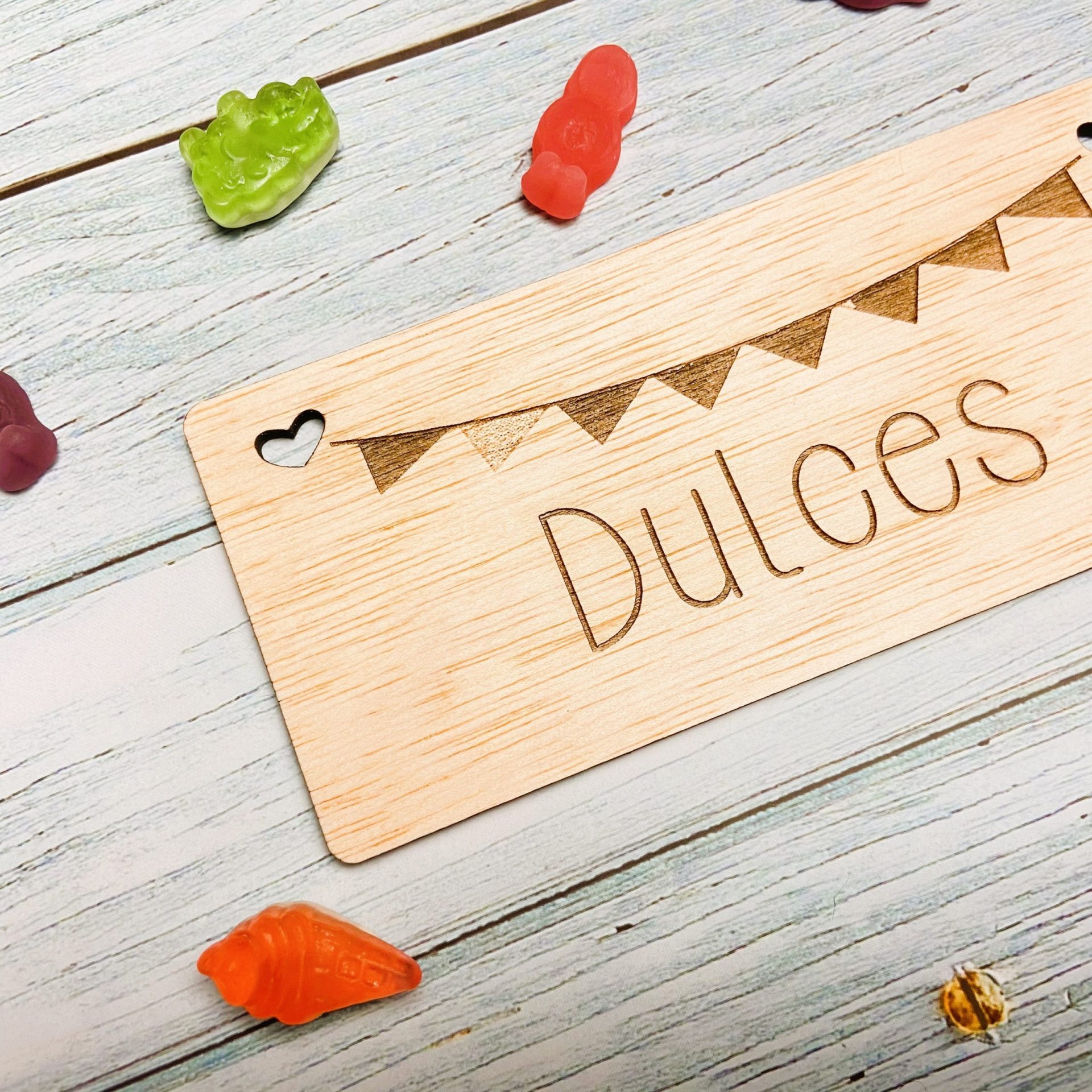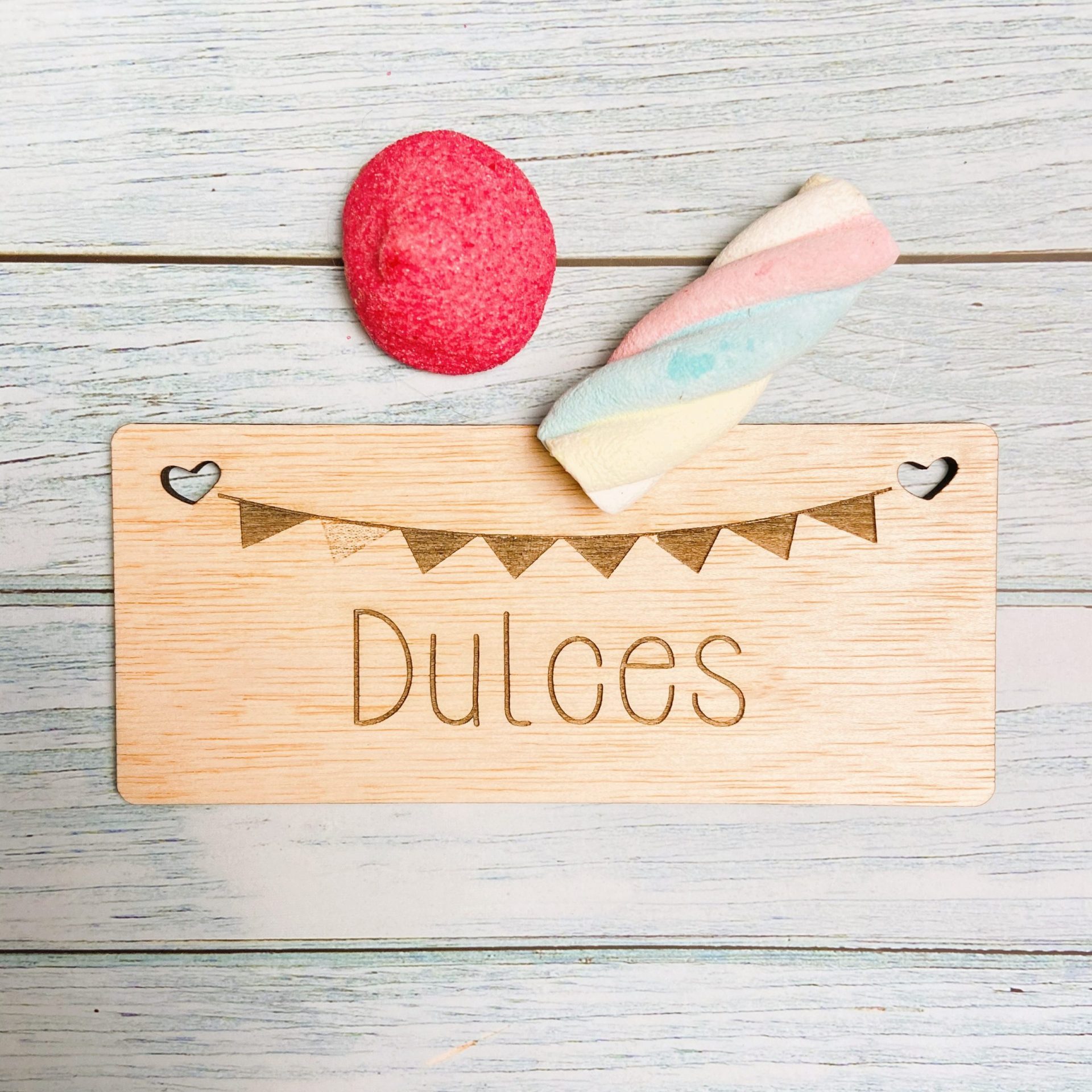 Precioso cartel de madera en madera DULCES con diseño de banderines, ideal para adornar el rincón más SWEET en todo tipo de fiestas: bodas, comuniones, bautizos, …