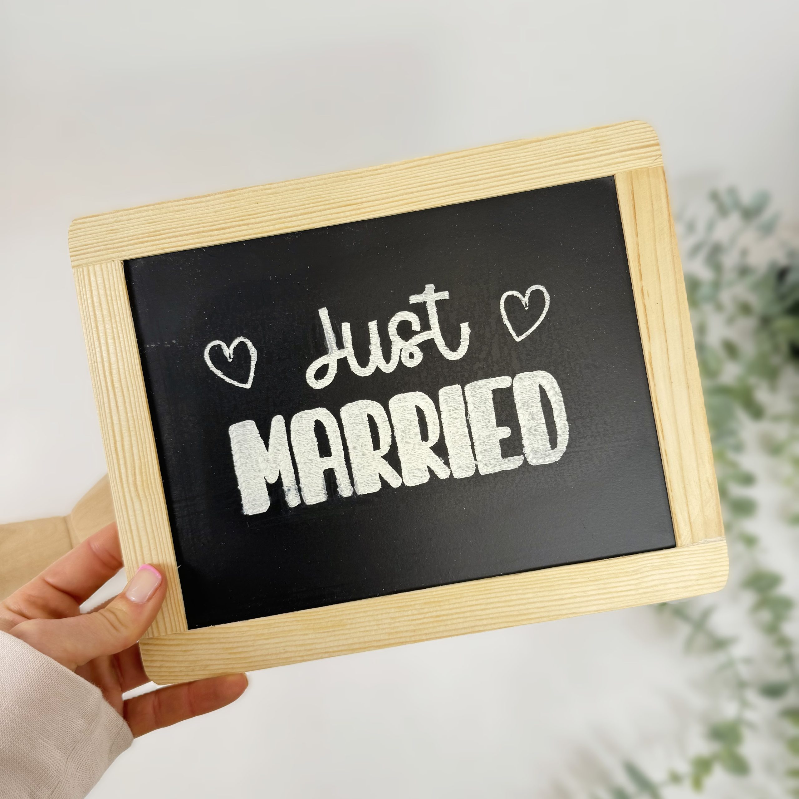 Cartel tipo pizarra «JUST MARRIED», sencillo y elegante para lucirlo durante el gran día. Combinadlo con el resto de carteles tipo pizarra para sorprender a todos en vuestra boda.