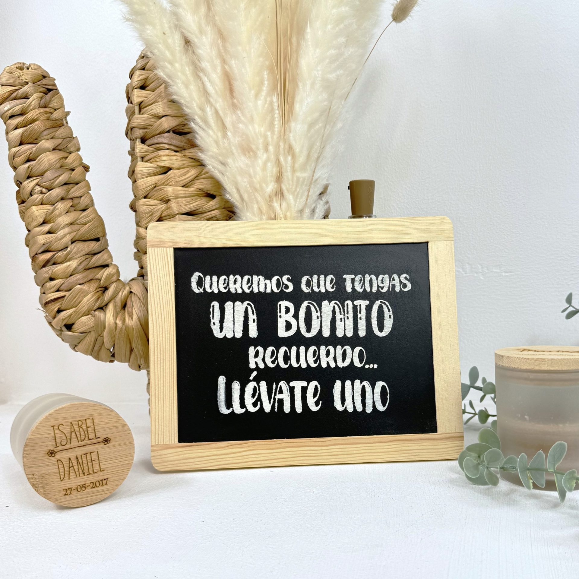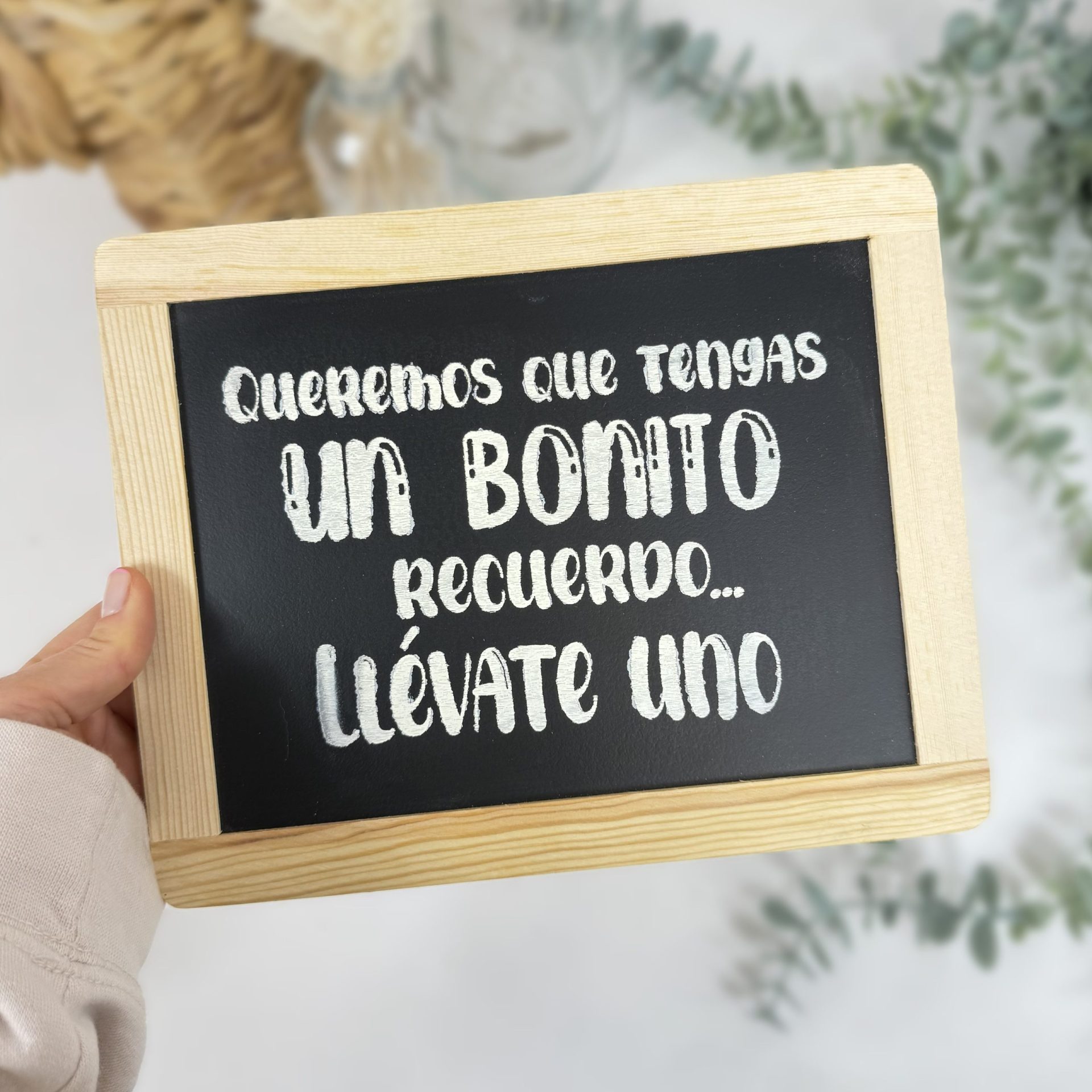 Cartel tipo pizarra «QUEREMOS QUE TENGAS UN BONITO RECUERDO… LLÉVATE UNO», perfecto para poner con los detalles que vayáis a regalas a vuestros invitados. ¡Combinadlos con el resto de carteles tipo pizarra para sorprender a todos en vuestra boda!