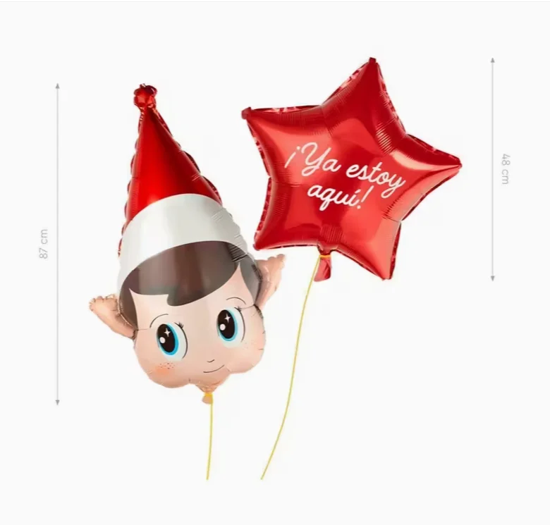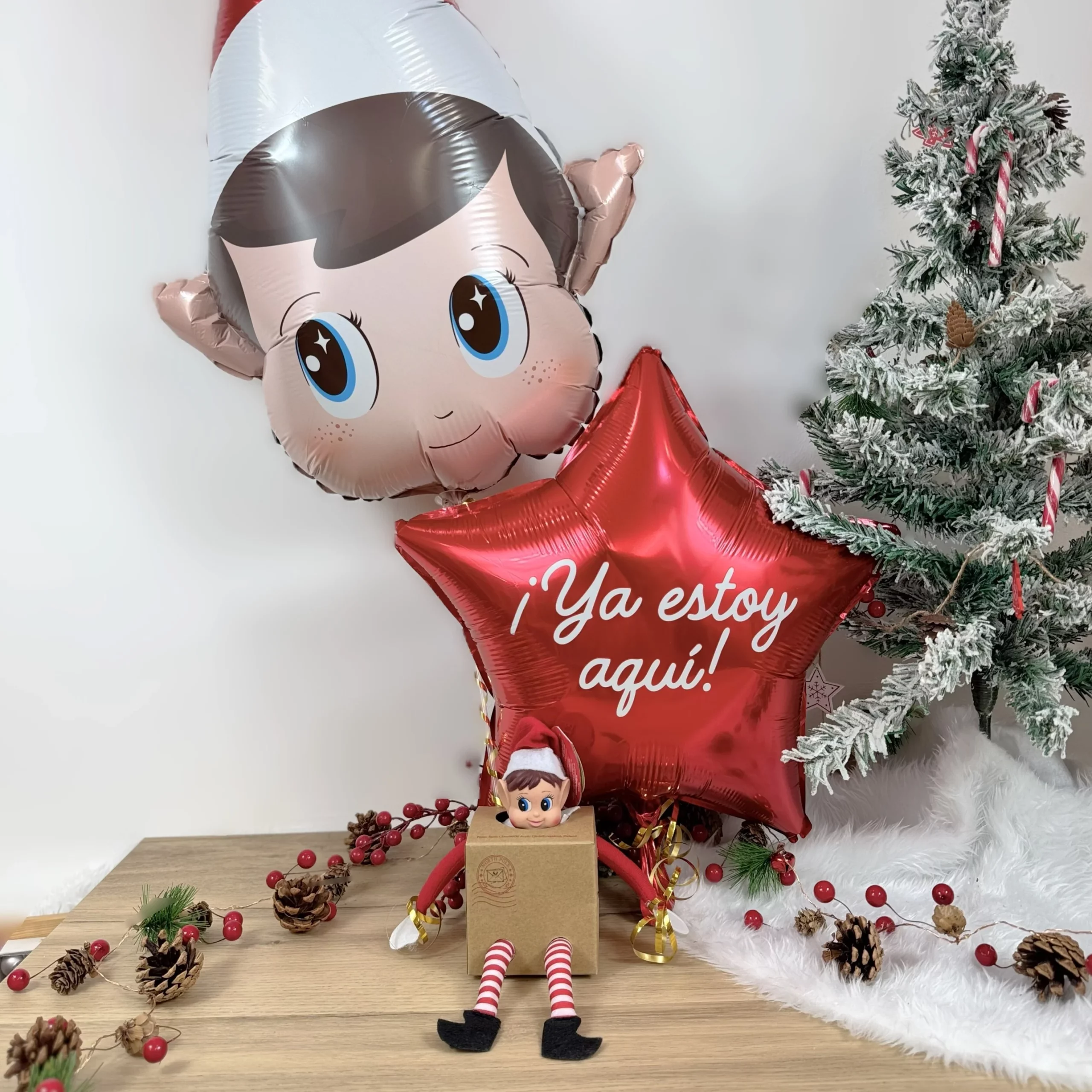 🎅🏼 Puedes elegir entre elfo chico o chica (Elvie o Elfie) —ambos de 30 cm, con sus características orejotas, ropa a rayas y sonrisa encantadora—, y si quieres hacer su llegada aún más espectacular, puedes añadir los globos gigantes: uno con su carita y otro con la frase «¡Ya estoy aquí!», ideal para crear un momento wow al abrir la puerta por la mañana. 🎈🎈