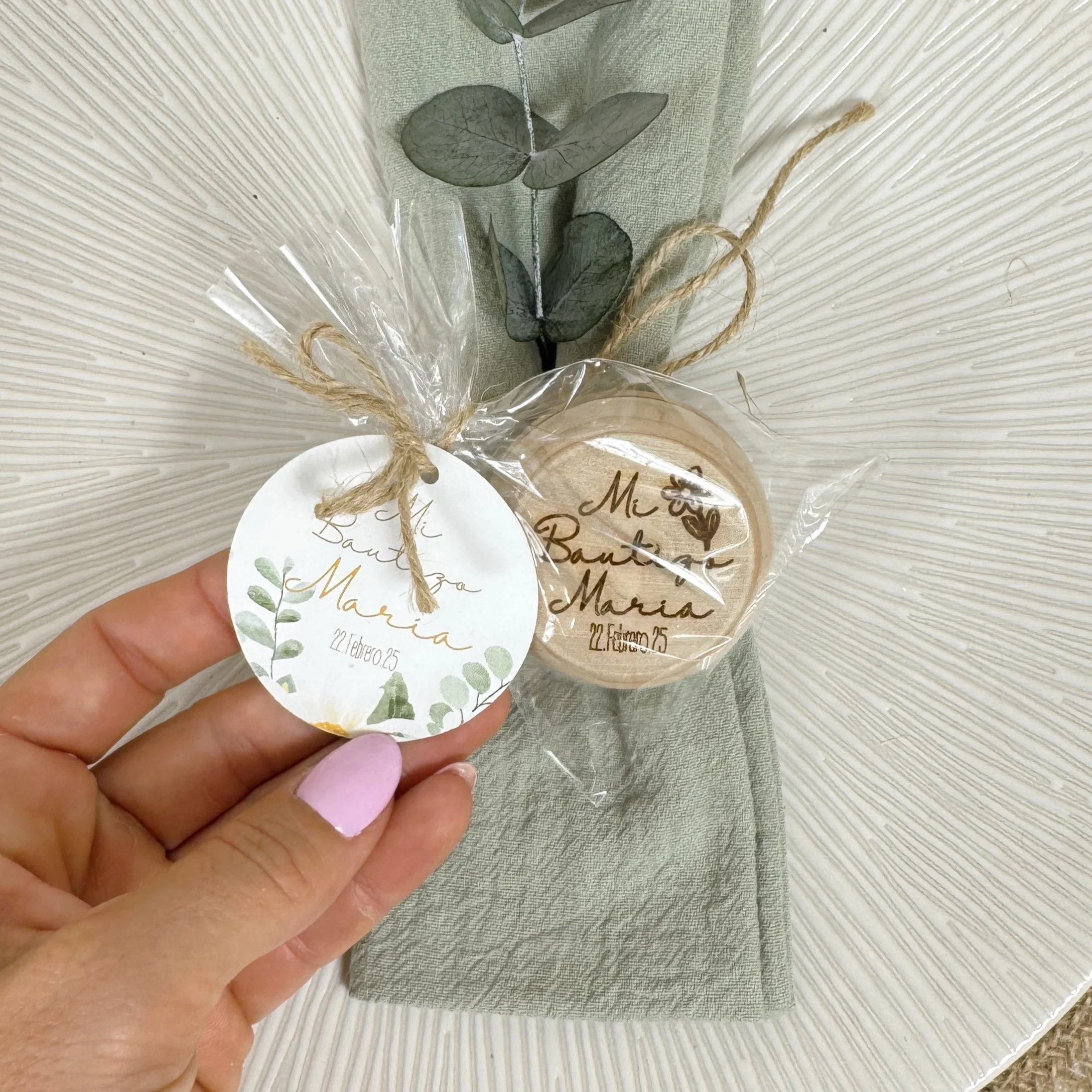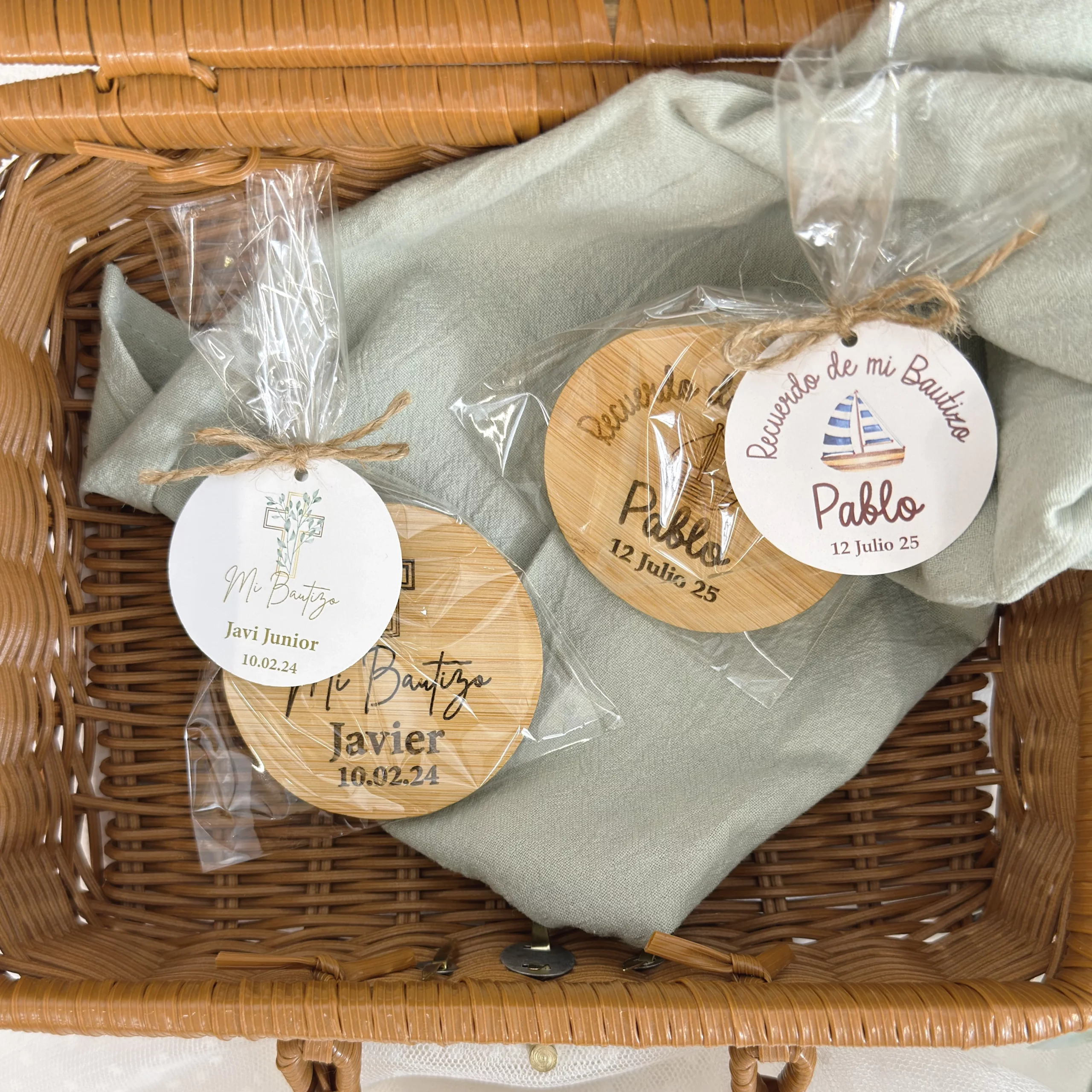 Este tipo de etiquetas son perfectas para mamás detallistas. Acompañadas de nuestros productos grabados (como los yoyós o los espejos de bambú), crean composiciones preciosas. Si te gustan los conjuntos armoniosos y con estilo, puedes combinar las etiquetas con la misma gama de diseño que el resto de tus regalos de bautizo. ¡Todo quedará ideal!