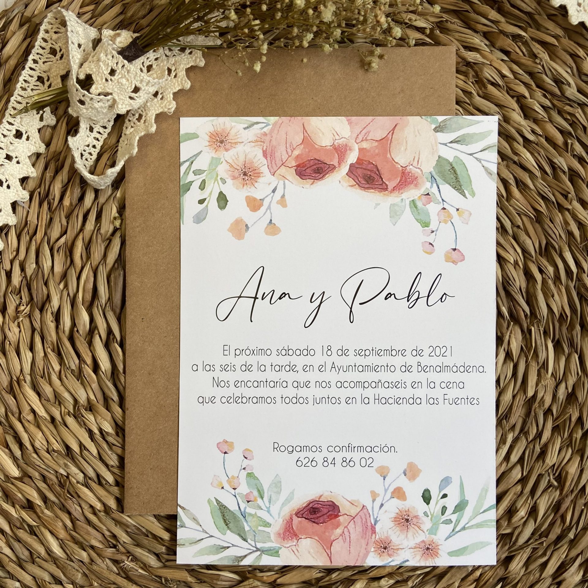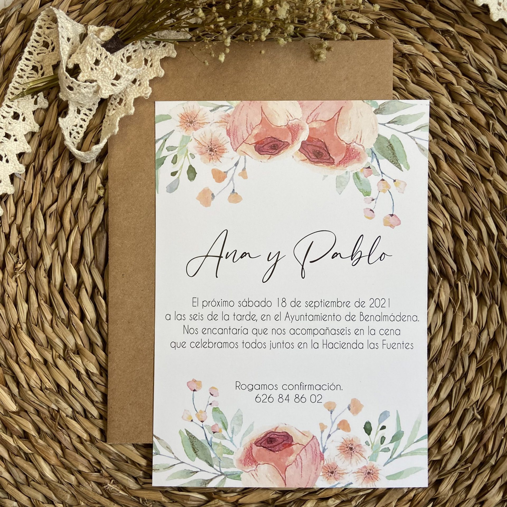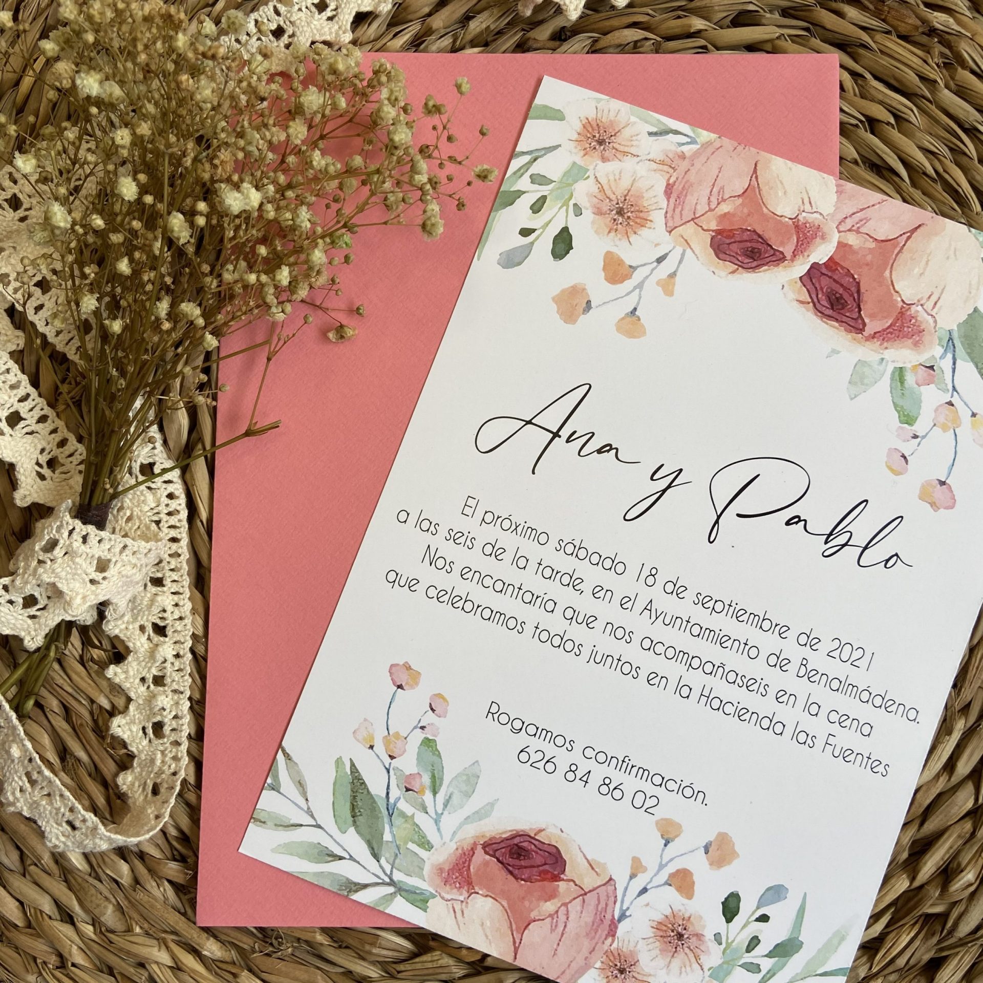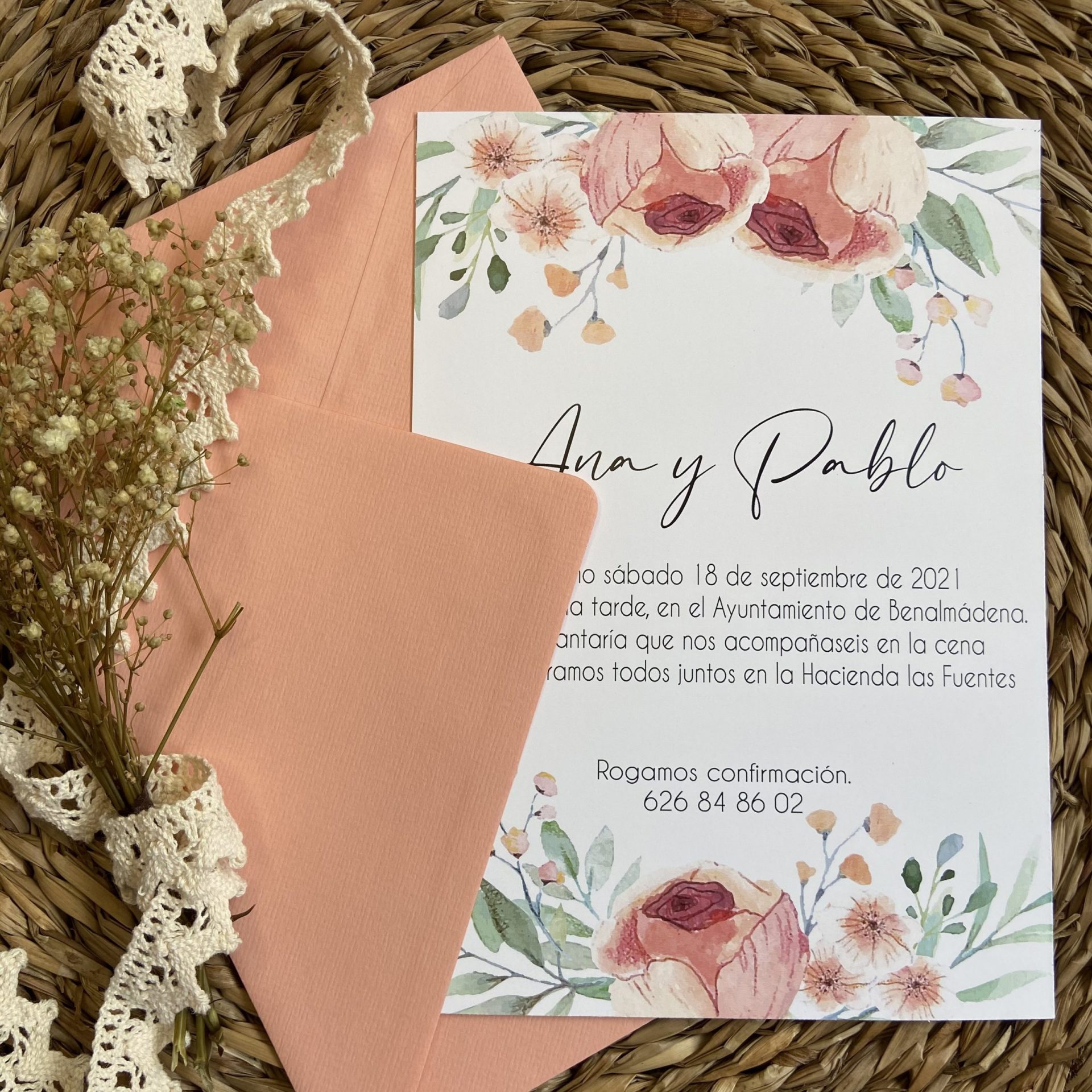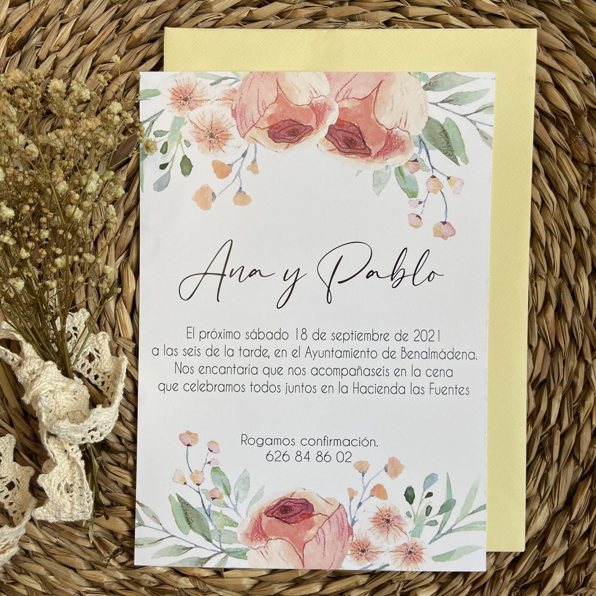 Flores Primaver es un modelo de invitación cerrado en cuanto al diseño, por lo que solo es posible personalizar el texto. Están diseñadas sobre papel blanco verjurado, con un gramaje de 300 gramos.