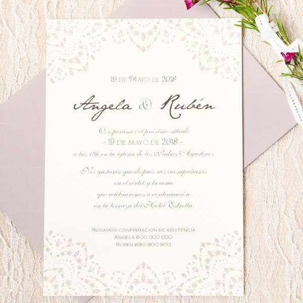 Vintage con encaje es una de las invitaciones que componen nuestra línea Classic, es un modelo cerrado en cuanto al diseño, por lo que solo es posible personalizar el texto. Están diseñadas sobre papel crema liso, con un gramaje de 290 gramos.