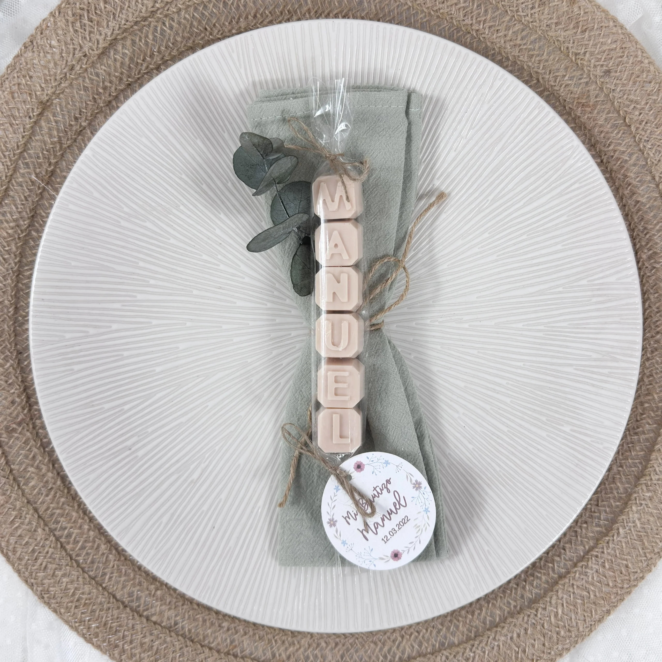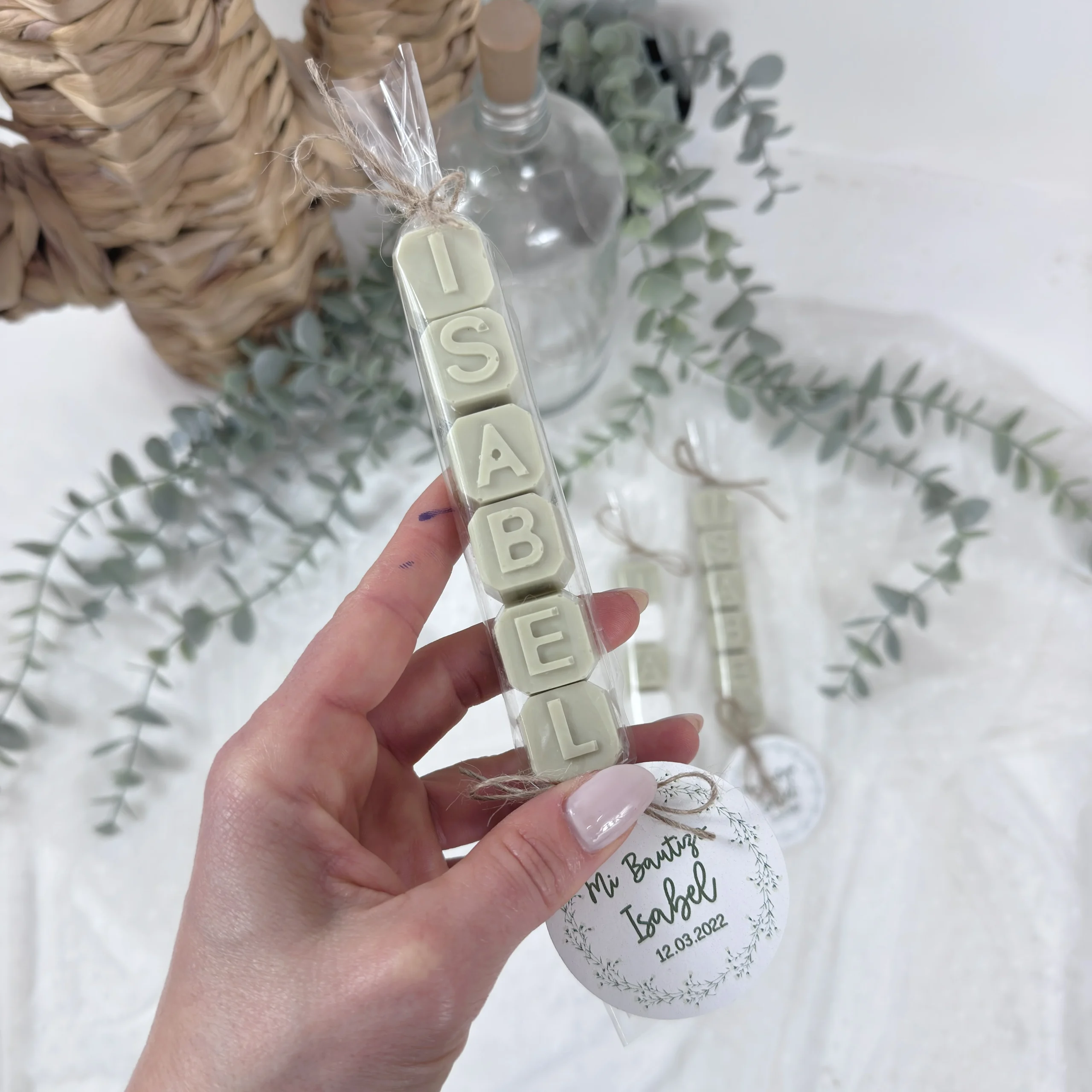 No son un recuerdo cualquiera. Son un detalle con presencia, con mimo y con muchísima personalidad. Cada unidad está formada por pequeñas piezas de jabón con forma de letra, colocadas en vertical para formar el nombre del peque. El resultado es delicado, original y muy llamativo, perfecto para bautizos donde se cuida la estética y los pequeños detalles.