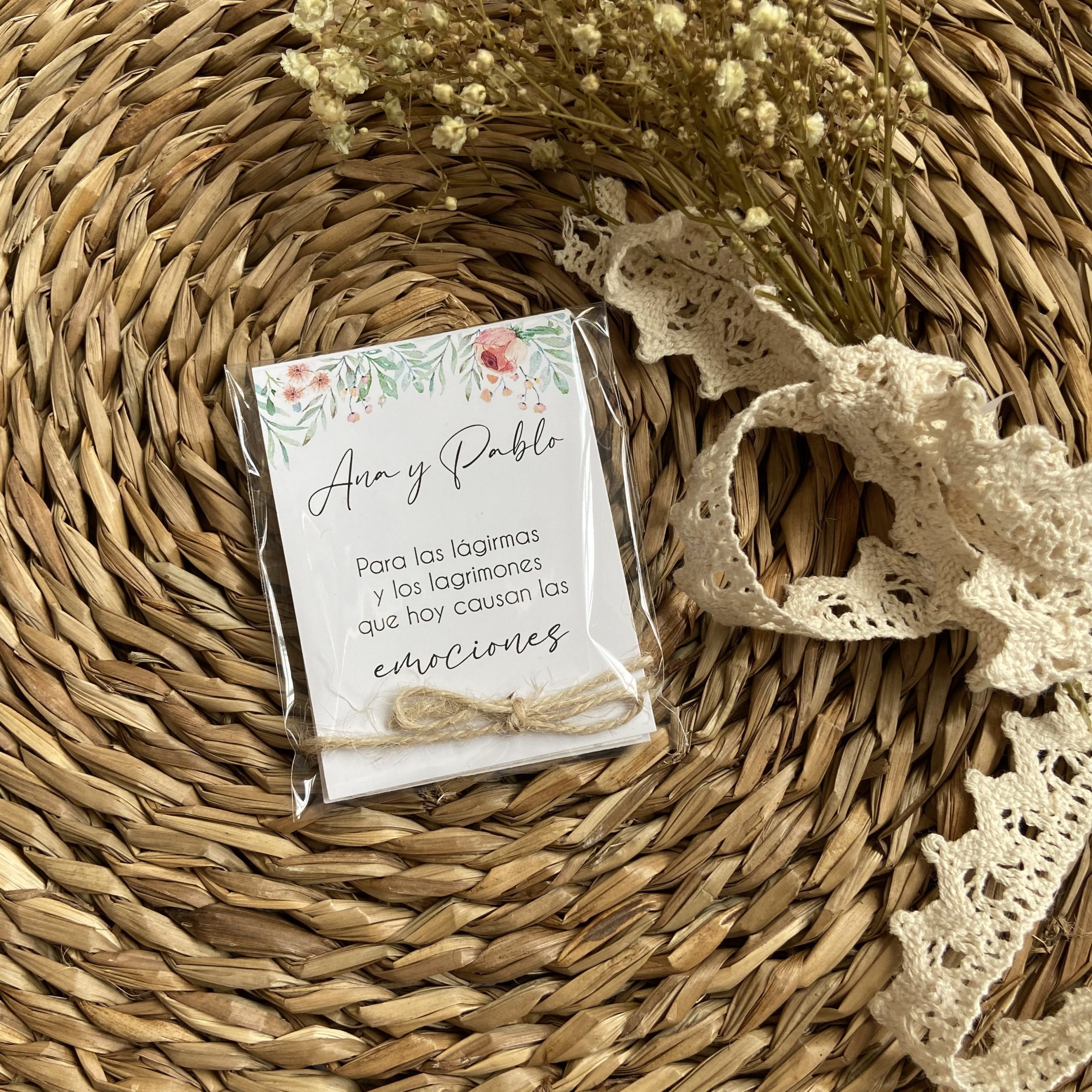 En toda boda se viven momentos muy emotivos, y los sentimientos están a flor de piel. Por ello, no está de más tener un detalle con vuestros invitados y repartirles pañuelos para esas lagrimillas de felicidad que seguro se les van a escapar. Y, qué mejor que hacerlo de una forma original, de una forma individual, personalizada y con una frase divertida.