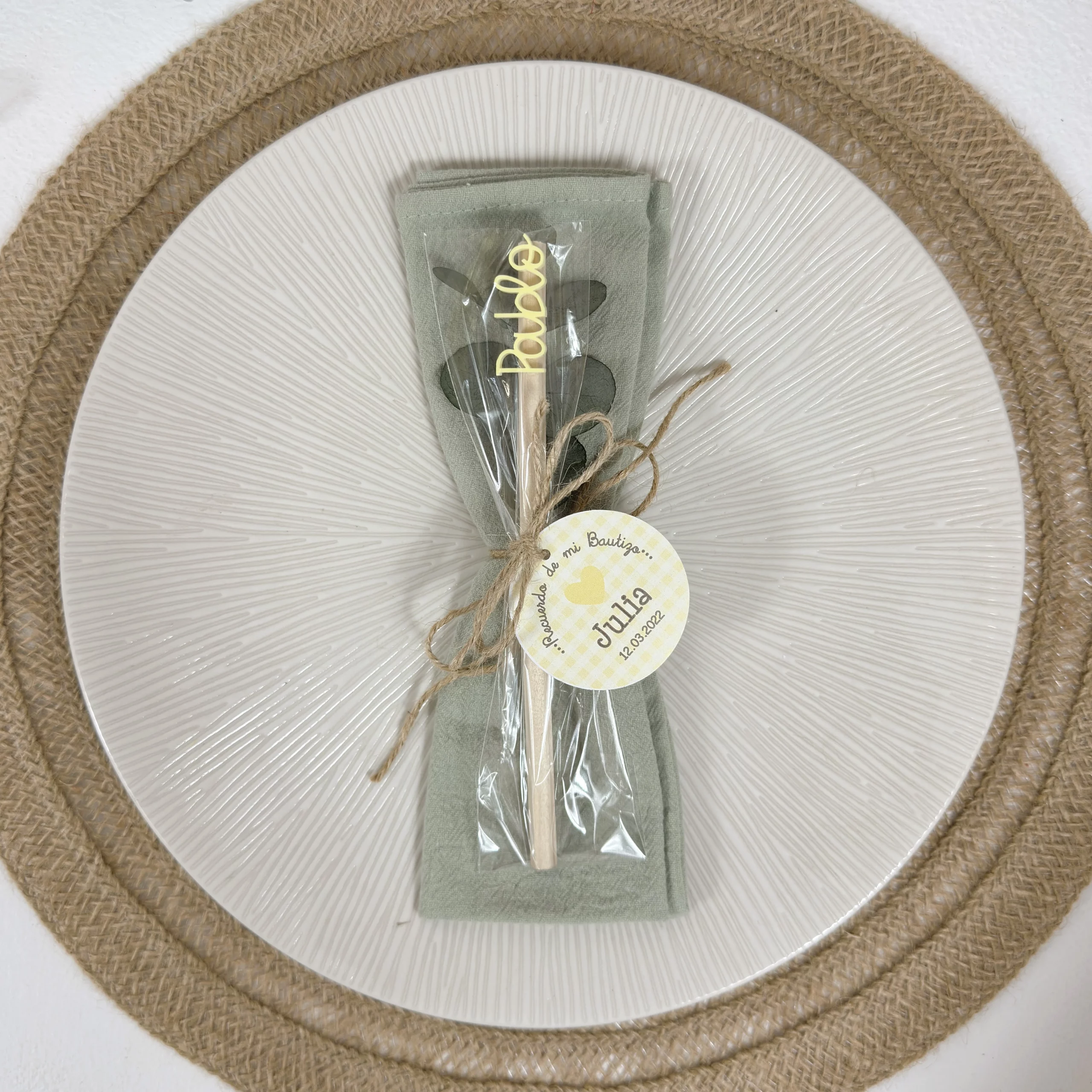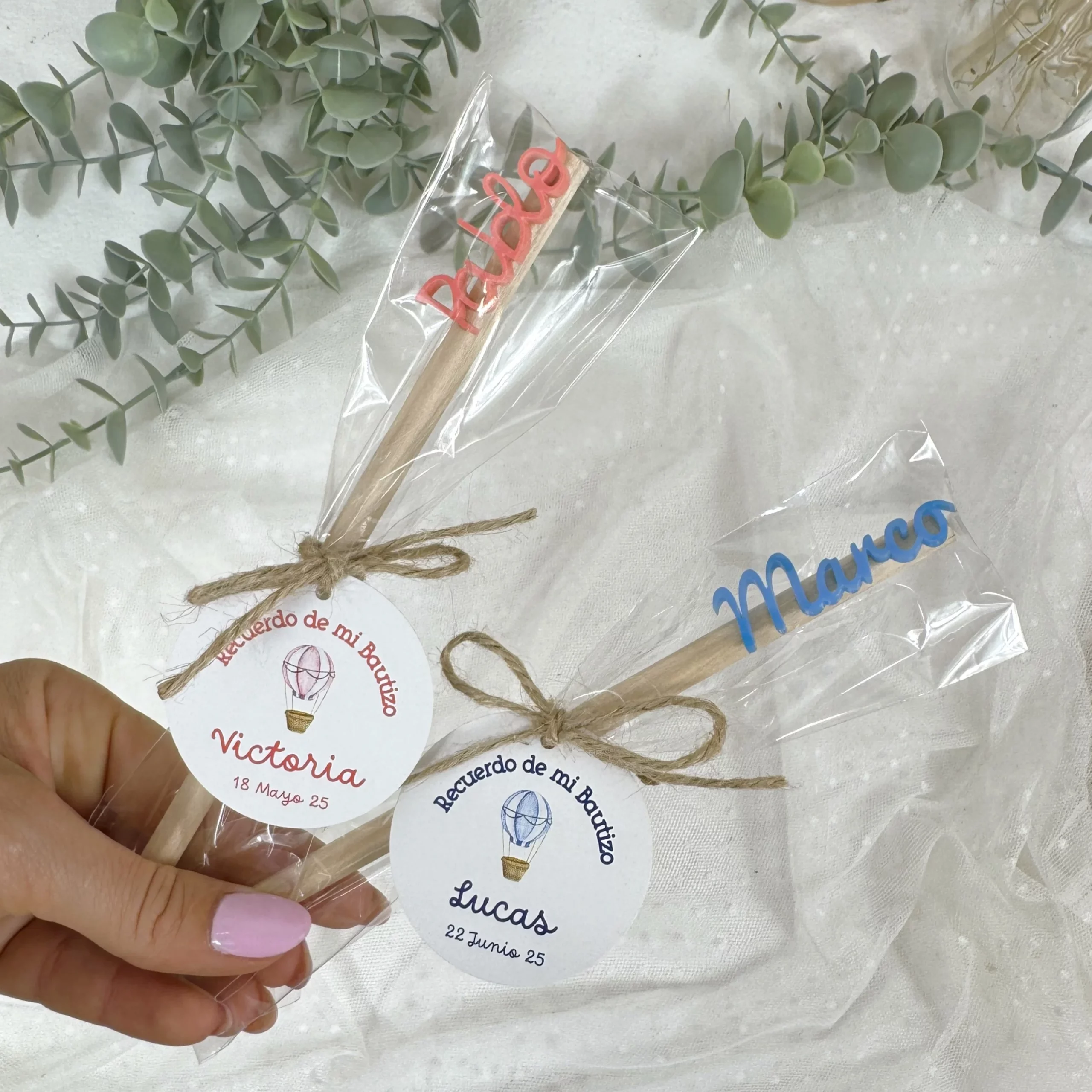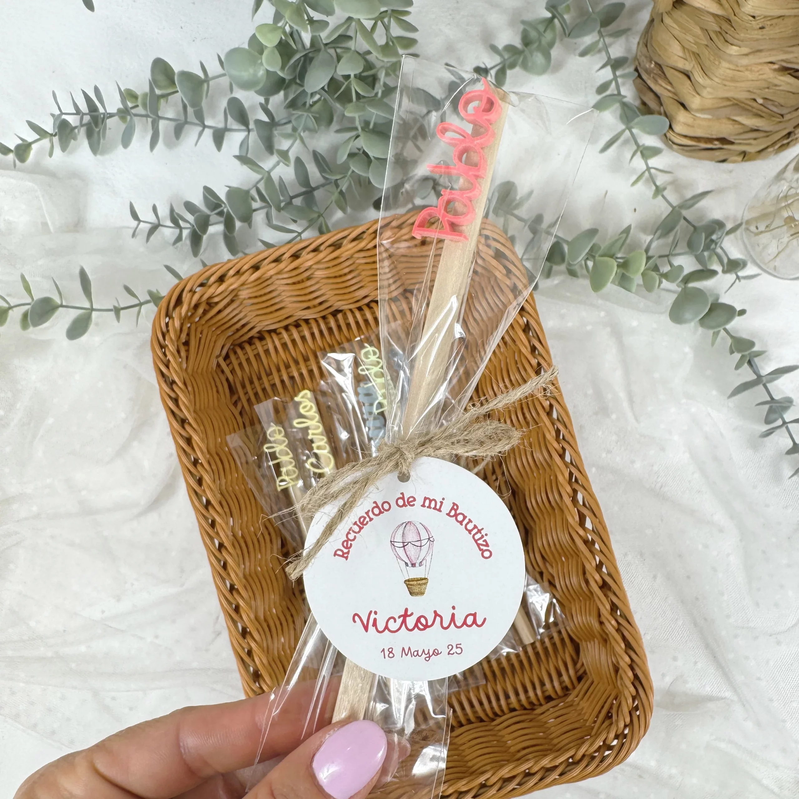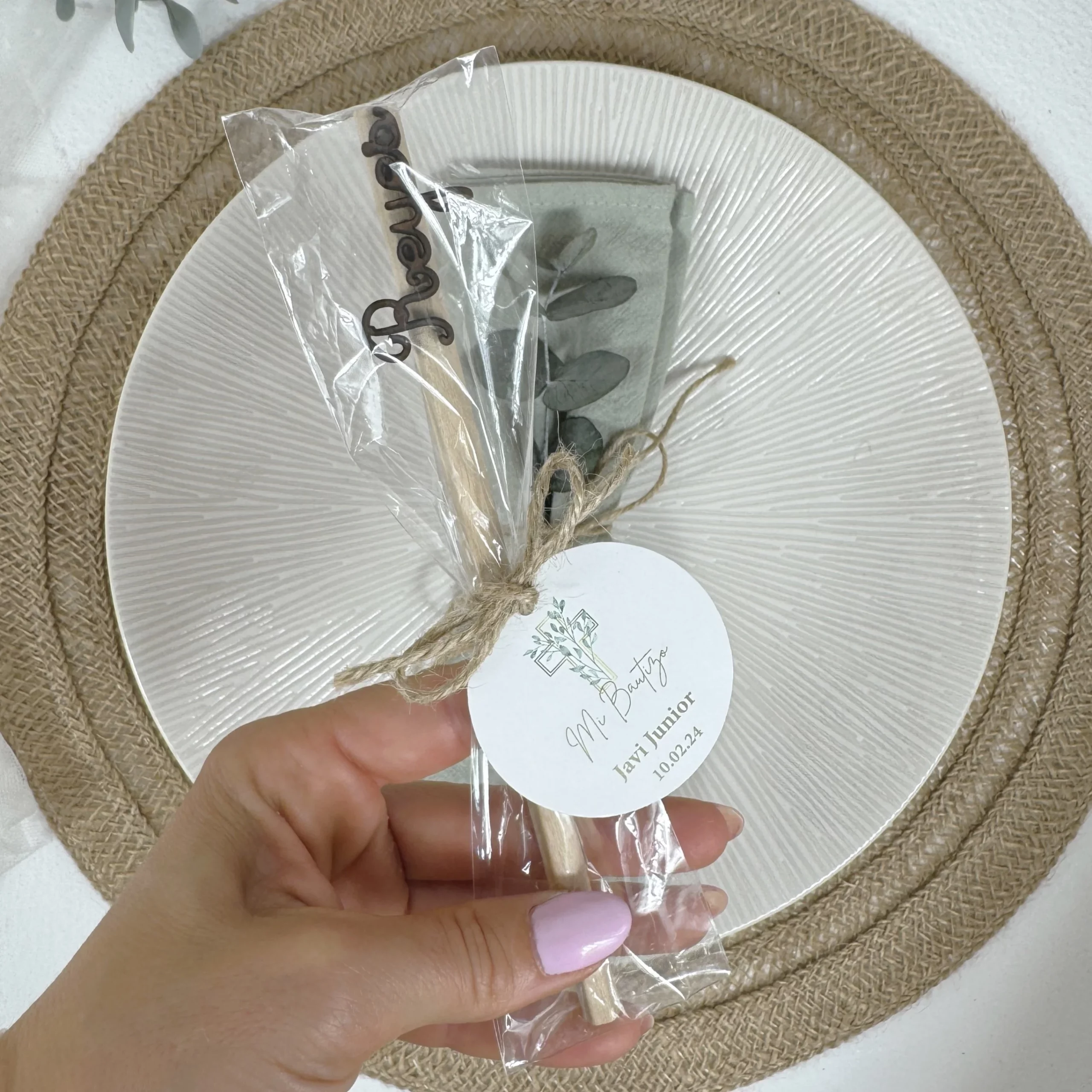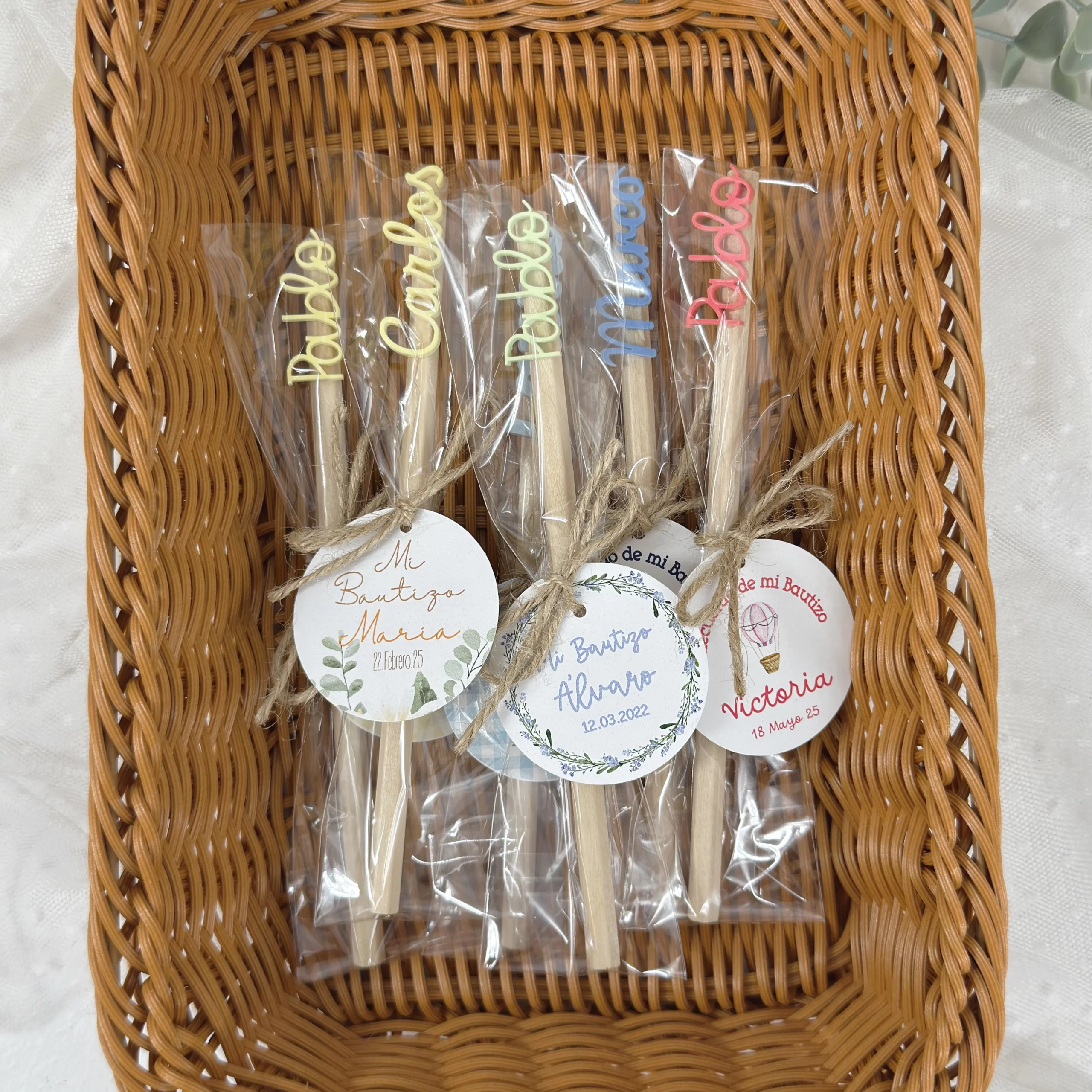 Hechos en madera natural, cada lápiz lleva grabado el nombre de tu invitado en metacrilato o madera —tú eliges el material y el color—, convirtiéndose en un detalle funcional y memorable. Además, puedes añadir la opción Listo para regalar, que incluye una bolsita y etiqueta a color con el mismo diseño que elijas para el resto de detalles del bautizo.