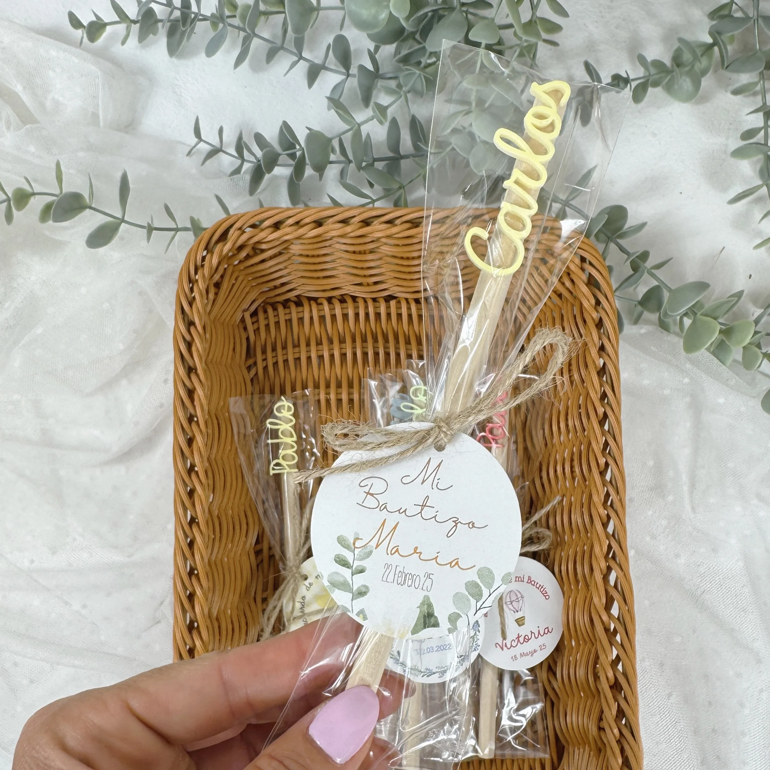 Incluye bolsita + etiqueta personalizada en el diseño a juego con tu bautizo. Ideal para presentar en la mesa o entregar como recuerdo.
