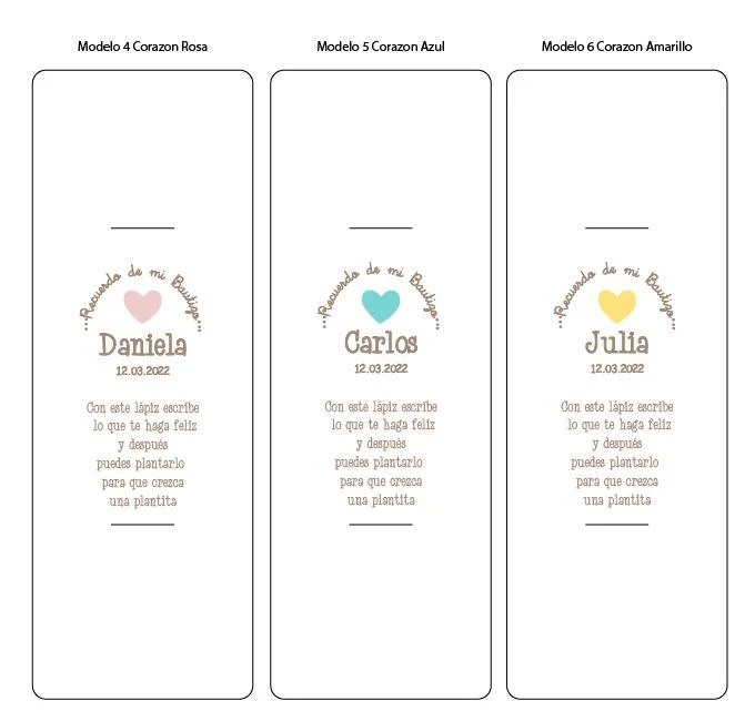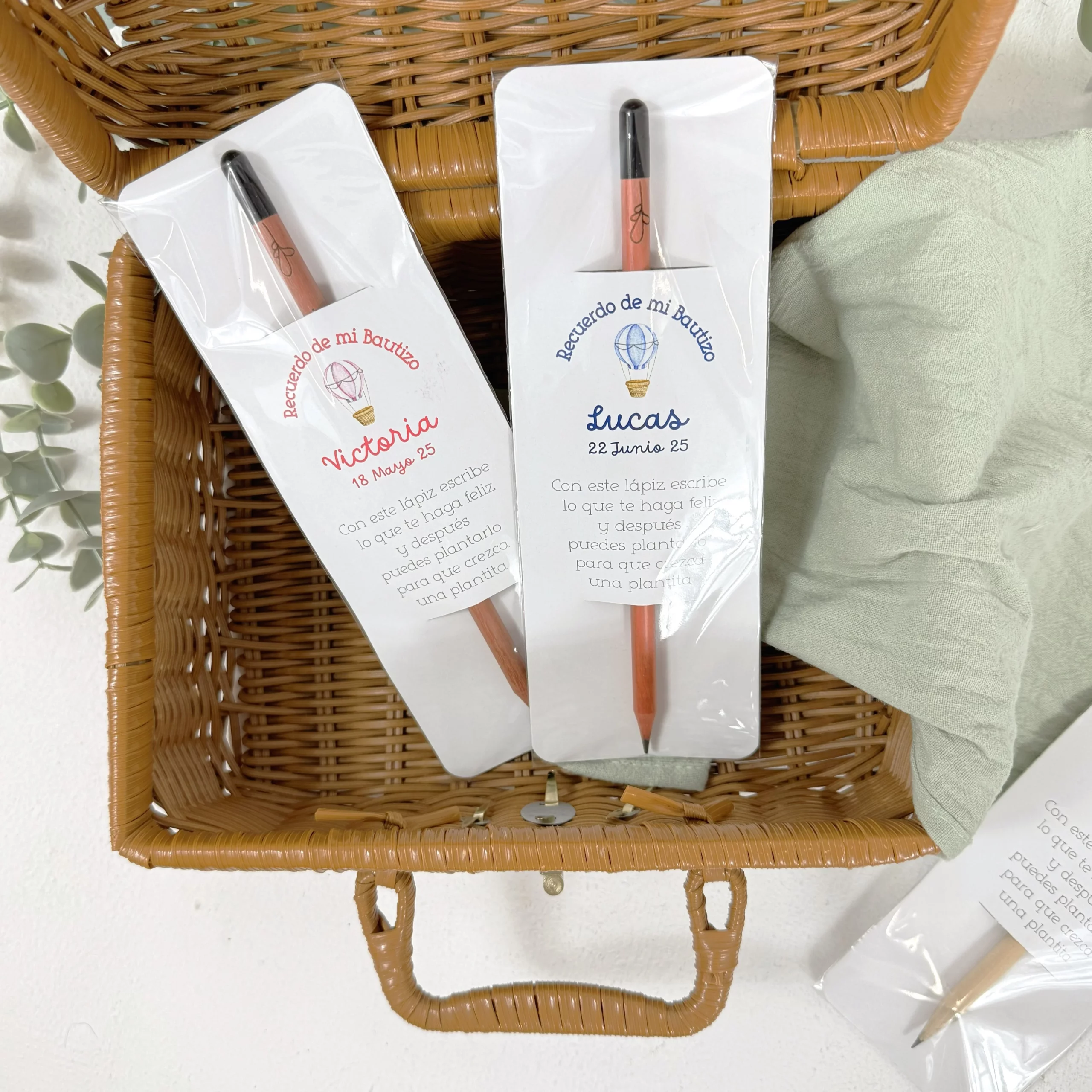 Cada lápiz se acompaña de un cartoncito personalizado, diseñado a color con nuestras colecciones de bautizo.