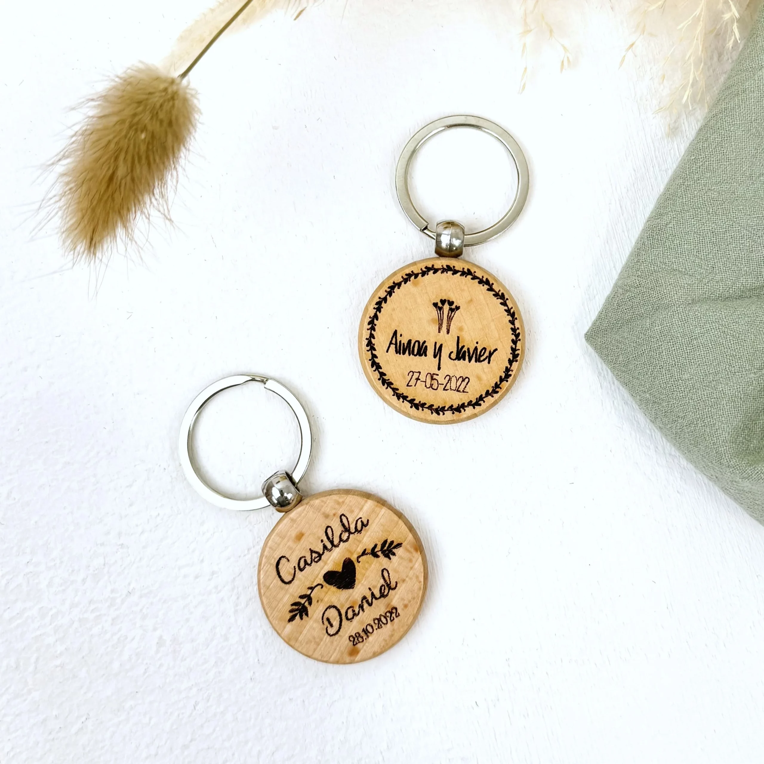 Este llavero está fabricado en madera de haya natural, un material resistente y con un acabado precioso, con vetas y ligeras variaciones de tono que hacen que cada pieza sea única. Además, va personalizado con grabado láser, para que los nombres y la fecha queden definidos, limpios y duraderos con el paso del tiempo.
