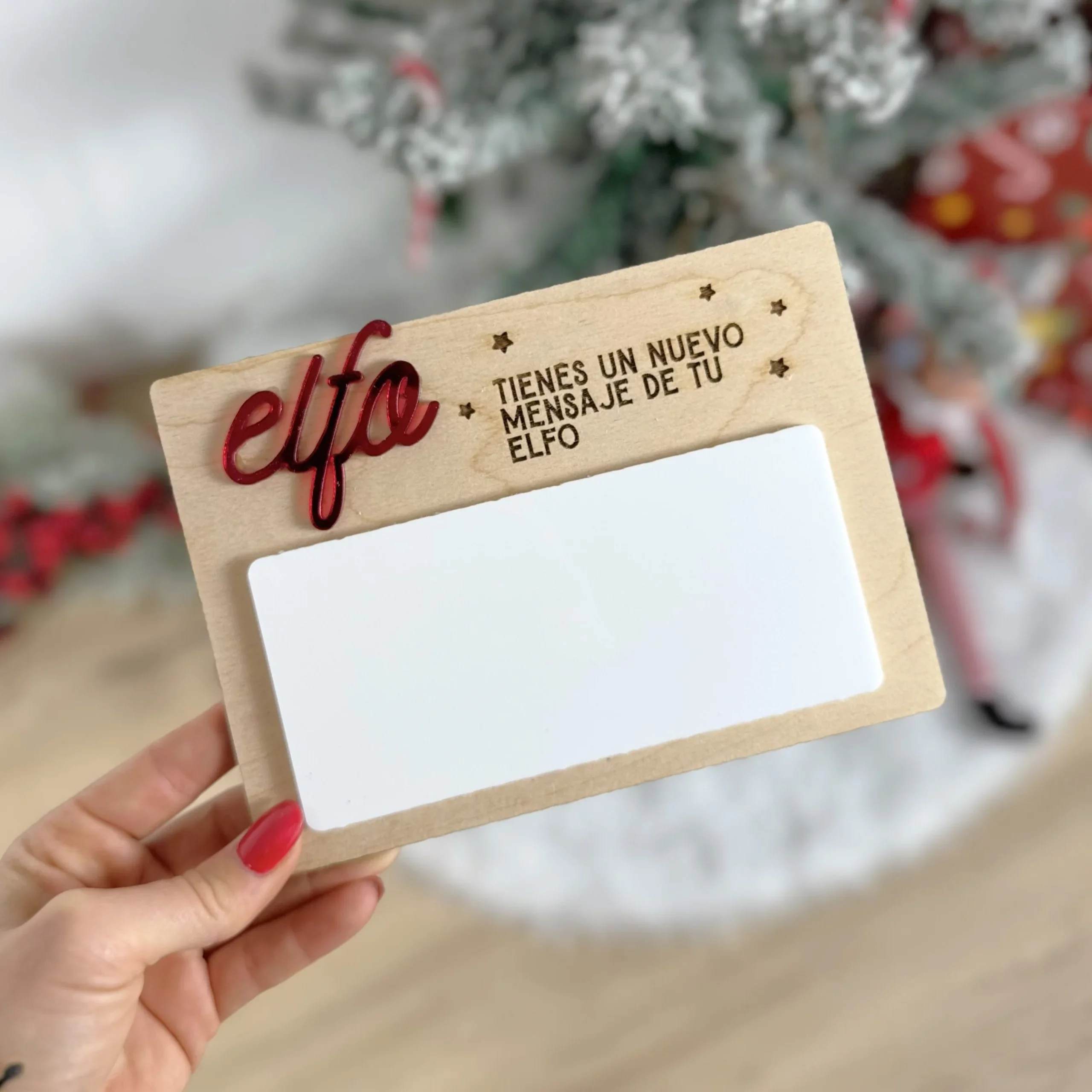 En la parte superior lleva grabado “Tienes un nuevo mensaje de tu elfo”, rodeado de pequeñas estrellas, creando ese ambiente mágico que hace que los peques se acerquen cada mañana con emoción para ver qué ha pasado durante la noche. La zona blanca de metacrilato funciona como pizarra: se escribe con rotulador tipo pizarra o rotulador borrable y se limpia en unos segundos. Así, cada día es una nueva sorpresa.