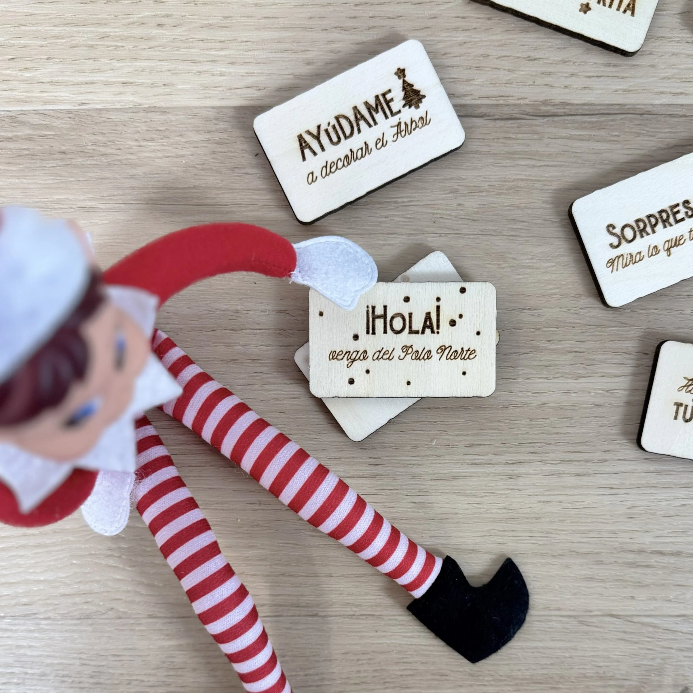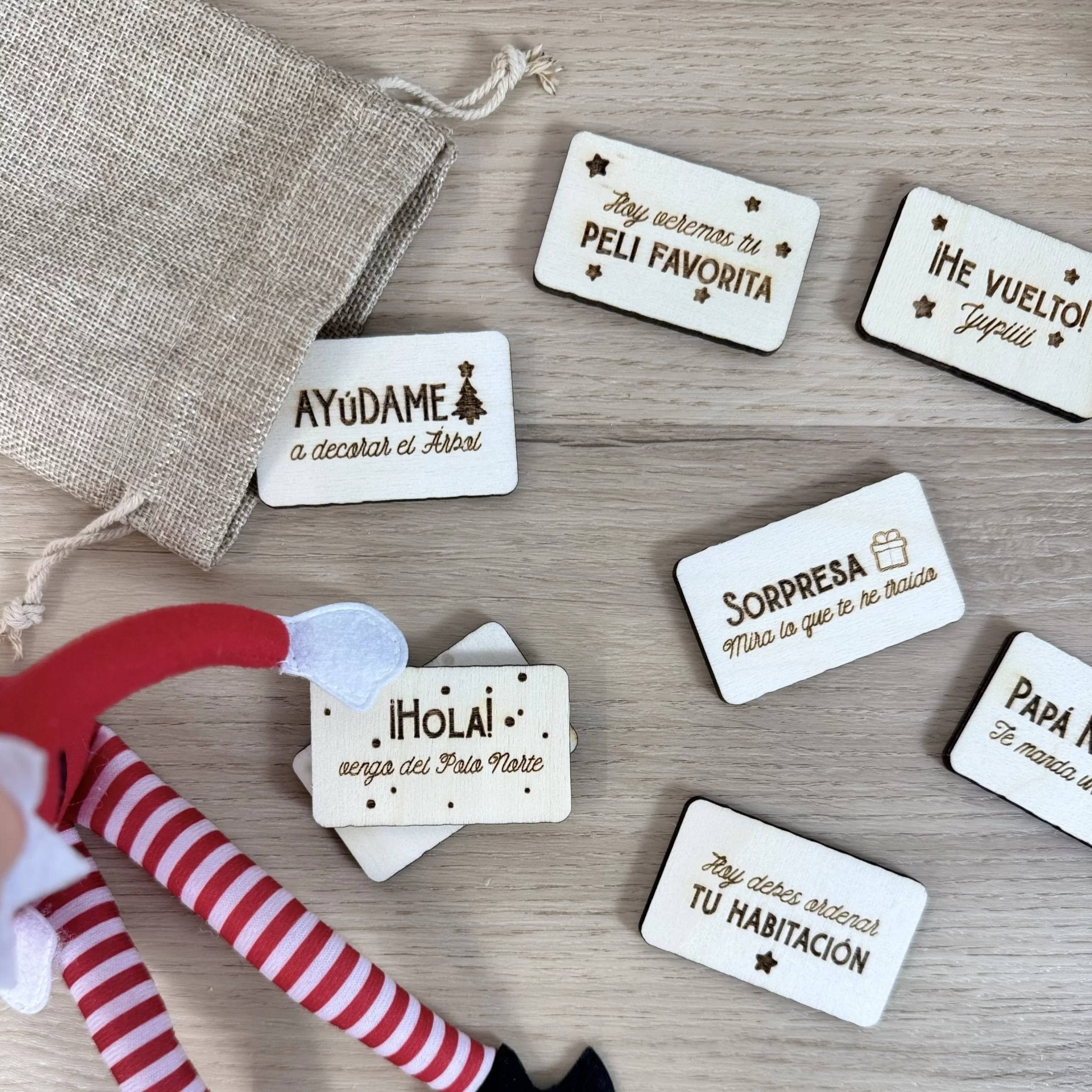 Estas mini placas de madera con mensajes grabados son el complemento perfecto para que el elfo pueda “hablar” con los peques, dejar pistas, proponer actividades o simplemente saludar. Son dulces, divertidas, bonitas y súper prácticas: un imprescindible para familias que quieren disfrutar del elfo sin tener que improvisar cada día.