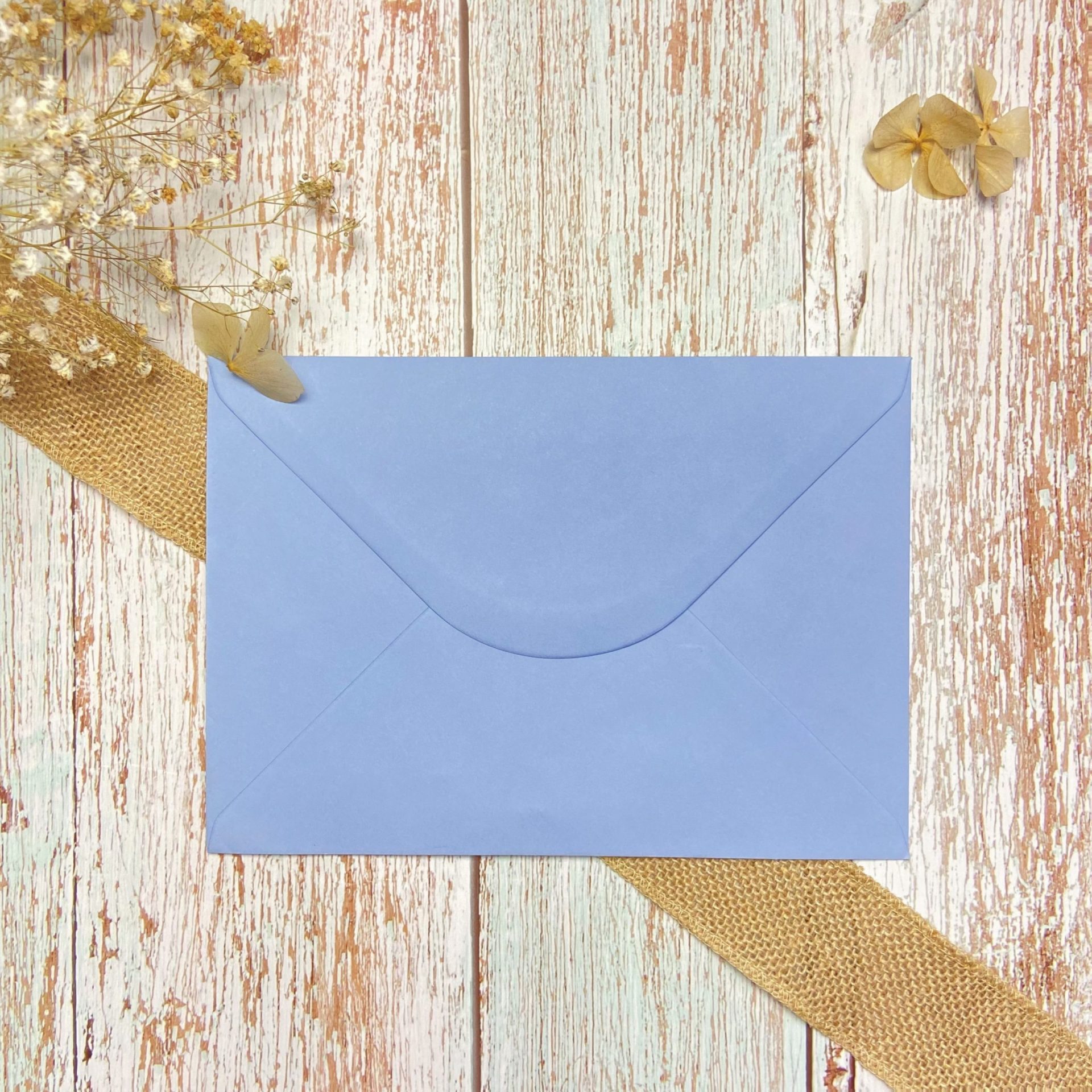Sobre de color azul celeste para invitaciones, 164×230 mm, tamaño C5, calidad 120 gr. Solapa redondeada engomada.