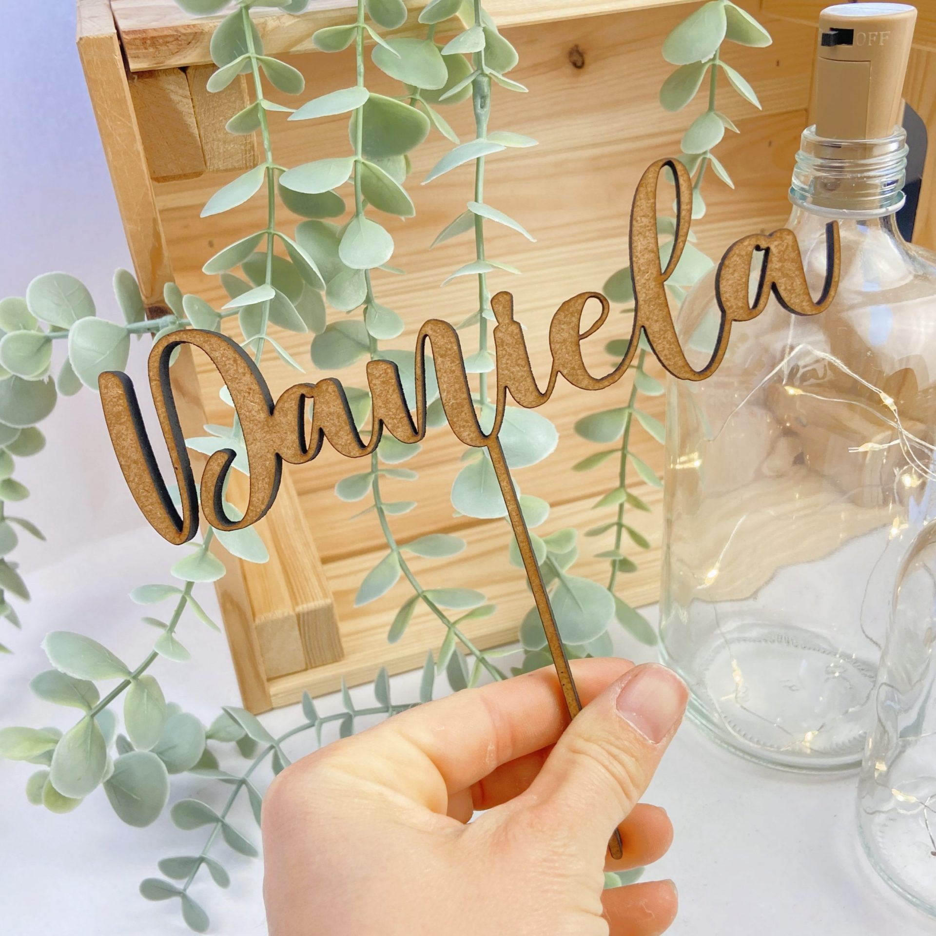 Nuestro topper está disponible en dos materiales versátiles y decorativos: madera DM (natural, cálida, rústica) o metacrilato (brillante, moderno, llamativo). Ambos materiales permiten que puedas adaptarlo al estilo de tu fiesta y crear una decoración coherente y personalizada.