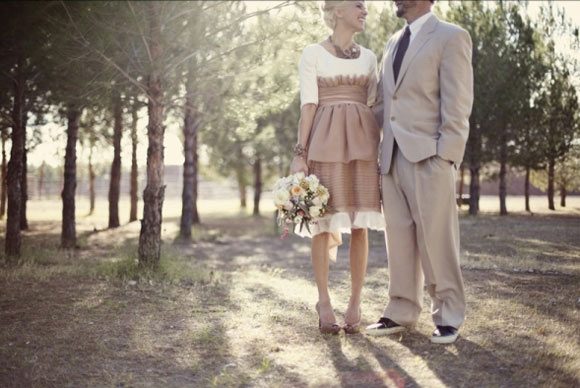 Seguro que alguna vez has visto las fotos en sepia de la boda de algún familiar ¿por qué no imaginar a tu flamante esposo vestido de marrón chocolate con chaleco marfil a juego y a ti misma en un vestido marfil de corte entallado y pequeños bordados? Un broche antiguo con plumas como tocado y una cascada de pequeñas campanillas en tonos salmón y marfil como ramillete.