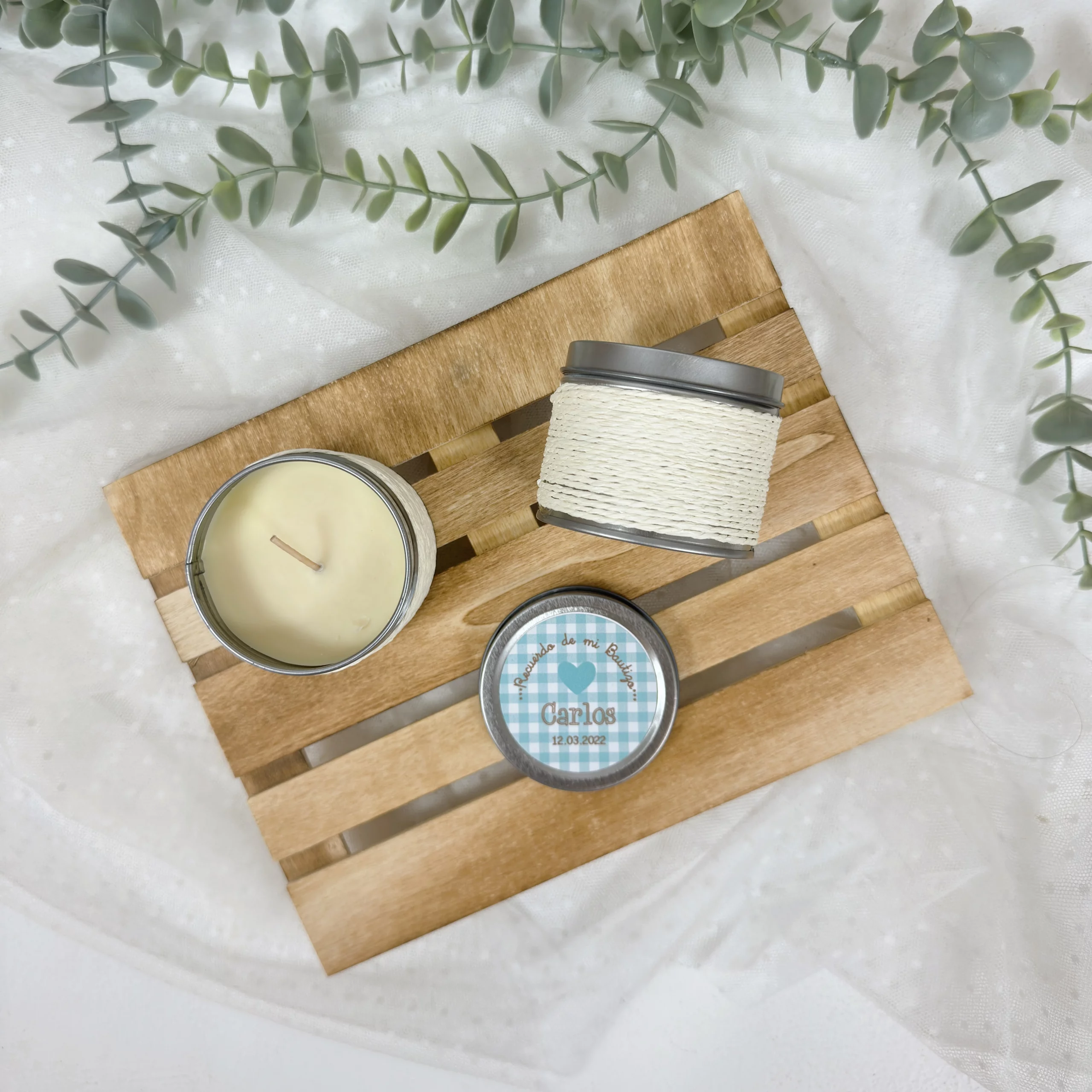 Se trata de una preciosa vela aromática presentada en una lata metálica con tapa, decorada con una pegatina a color personalizada con el nombre del bebé, la fecha del bautizo y el diseño que elijas entre los muchos disponibles. Todo pensado para crear un recuerdo inolvidable, original y práctico que, además, será parte de la decoración de la mesa ese día.